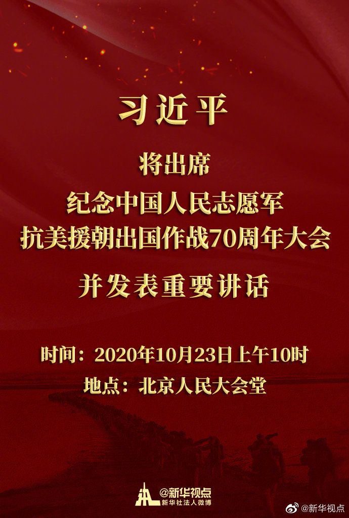 纪念中国人民志愿军抗美援朝出国作战70周年大会将于23日上午10时在北京人民大会堂隆重举行。中共中央总书记、国家主席、中央军委主席习近平将出席大会并发表重要讲话。 届时,中央广播电视总台、新华网将对大会进...