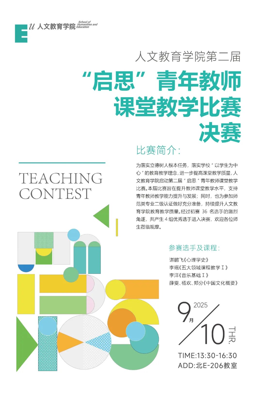 9月10日,适逢第41个教师节,人文教育学院第二届“启思”青年教师课堂教学比赛决赛在北E206教室落幕。历经初赛激烈角逐,学院四组青年教师带着精心设计的教学设计参加决赛。他们通过精彩的项目式教学带领学生内化知识点,通过生动的案例式教学深入浅出地解读枯燥理论,更以身体参与和感官打开的方式体验感知艺术之美。比赛生动展现了人文教育学院“以学生为中心”教学理念,现场的专家评委一致认为,青年教师们展现了扎实的教学能力和认真勤恳的教学态度。...