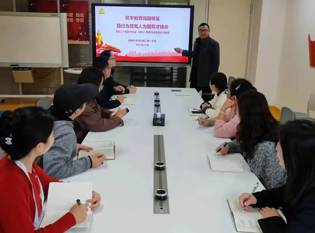 为深入学习贯彻党的二十届四中全会精神,准确把握《中共中央关于进一步全面深化改革、推进中国式现代化的决定》中关于教育事业的新部署新要求,近日,数据科学学院党总支以支部为单位,精心组织、周密安排,通过书记讲党课、集中学习研讨等多种形式,深入开展全会《建议》中教育相关内容专题学习活动,切实将思想和行动统一到党中央关于教育强国建设的重大决策部署上来。活动中,党总支书记、各党支部书记带头领学,围绕“教育定位”...