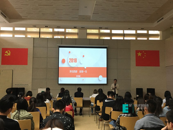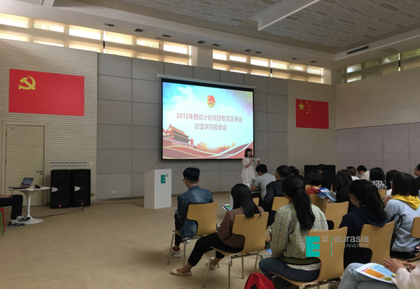 宣讲会开始,校团委书记余斐虎致欢迎词,他对宣讲团来到欧亚标识热烈的欢迎。他介绍,我校近年来累积向西部计划输送了一百多名毕业生志愿者,今年是第十六个年头,希望我校应届毕业生继续为西部地区的发展做出贡献。