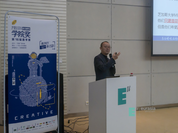 随后,创意大师易合博略品牌咨询机构总裁、创始人赵一鹤先生用“想法、章法、做法”三个关键词引出对“知识、经验、创造力”的解释。之后,赵老师用马克杯的故事形象生动地让同学们更了解“禀赋效应”。并从人性的“善”与“恶”两个角度诠释了人与人、人与社会、人与自然的关系,突出了“洞察”的重要性,让同学们明白了最优秀的传播和营销绝对不是靠戳中人性的弱点和丑恶而取胜,而是打动人性最柔软最美好的那一瞬间。