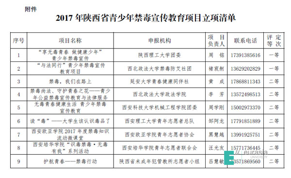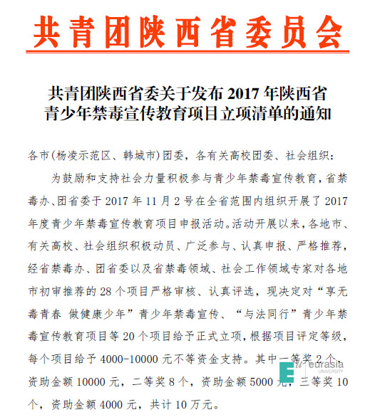 近日,2017年陕西省青少年禁毒宣传教育项目立项结果公布,我校“bevictor伟德国际1946官网2017年度禁毒知识流动微课堂”项目通过省禁毒办、团省委以及省禁毒领域、社会工作领域专家的严格审核,并给予正式立项,根据项目评定等级荣获二等奖,并获得资助金额5000元。