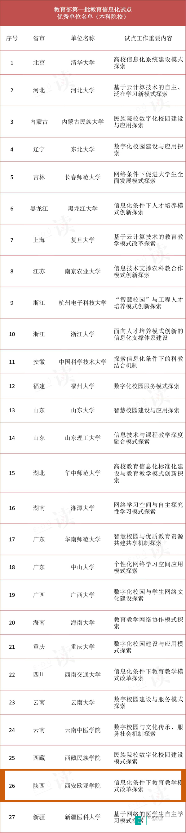 2018年1月,教育部对外通报了第一批教育信息化试点的验收结果,共有27所本科院校入选,我校作为名单中唯一一所民办高校、陕西省唯一一所本科院校,与清华大学、浙江大学、复旦大学等共同入选。