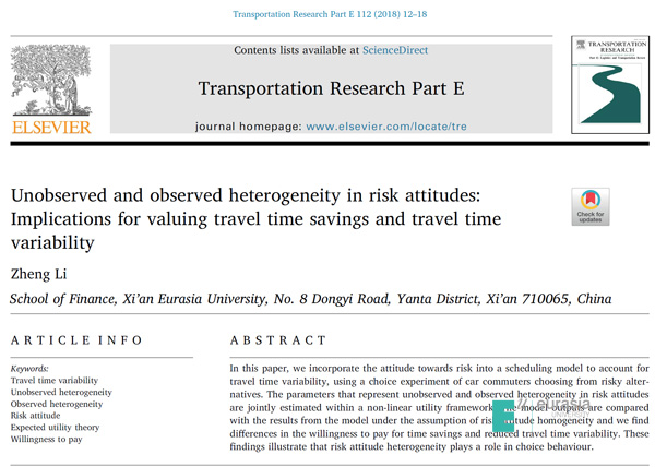 我校金融学院李铮(Zheng Li)博士撰写的英文论文“Unobserved and observed heterogeneity in risk attitudes: Implications for valuing travel time savings and travel time variability” 正式发表于国际期刊 - Transportation Research Part E: Logistics and Transportation Review;该期刊被两大权威文献检索系统: 社会科学引文索引SSCI (Social Sciences Citation Index) 和科学引文索引SCIE (Sciences Citation Index Expanded) 收录。