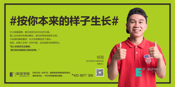几则故事诠释了欧亚,几个人物代表了欧亚人。欧亚的大学生活,满足你对梦想的所有想象。穿越时光,你会看到未来三四年后的自己——你在通宵自习室里备战考研;你在英国或美国的常春藤大学游学或进修;你拿到了心仪已久的企业OFFER;你策划了每年一度的春季运动会;你懂得装扮自己也能欣赏一场艺术展览;你不盲从大流,更遵循自己内心的价值观;你收获了友情,或是爱情。由此出发,大学如此多彩,开启在欧亚的每一天;由此开始,给梦想更多可能,带着欧亚的DNA追梦前行吧!