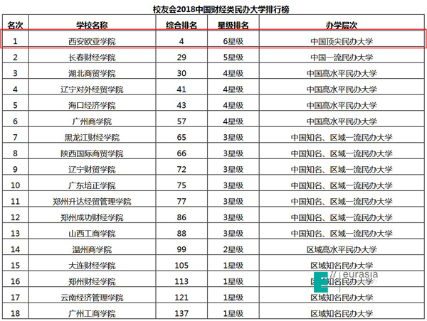 2017年12月25日,艾瑞深中国校友会网最新发布2018中国大学排行榜,我校连续五年蝉联“中国财经类民办大学排行榜”榜首。欧亚还以99.63分的高分位居全国民办大学排行榜第四、陕西第一,同时欧亚也跻身“中国顶尖民办大学”行列。