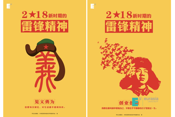 2018年3月5日,在学雷锋纪念日的第55周年之际,我校青年志愿者协会组织开展学雷锋宣传及践行活动。学生发展处及校团委组织设计了一组“2018年新时期的雷锋精神”的系列海报,由我校青年志愿者在校内招贴海报,并在线上线下进行宣传,号召我校师生坚定信念、不忘初心,做新时代雷锋精神的坚定擎旗者。