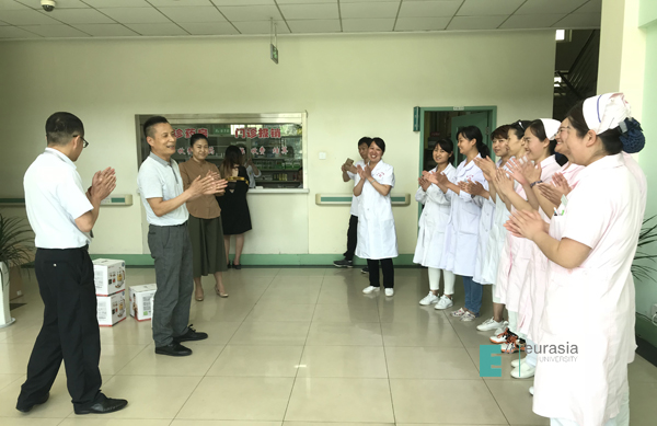 在第107个5月12日国际护士节到来之际,我校工会副主席晏建忠等工会人员及后勤集团领导,为学校门诊部医护人员们颁发了礼品。