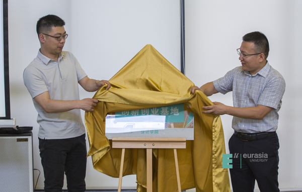 (图四)我校规划发展处处长王一冰与北航科技园国家级孵化器负责人冯健为“创新创业基地”揭牌