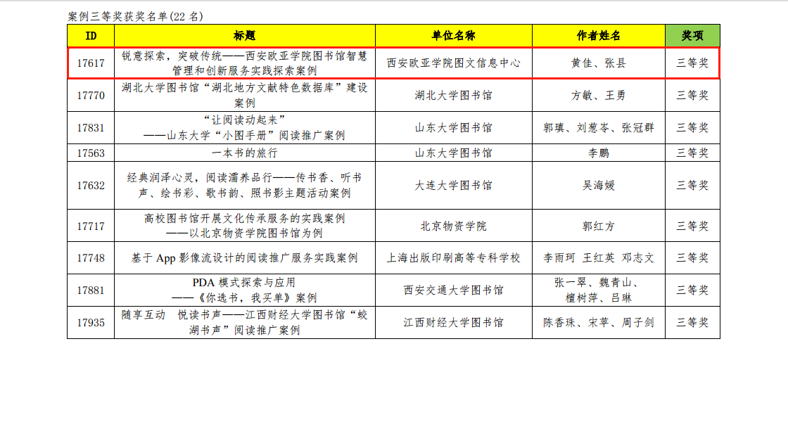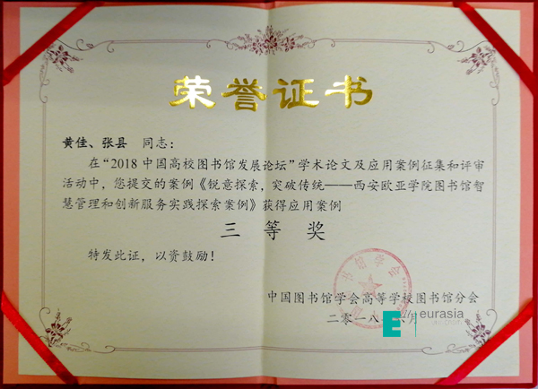 “2018中国高校图书馆发展论坛”学术论文及应用案例征集活动共计收到321篇学术论文,86篇应用案例。经资格审查、专家评审,并经主办方批准,本次活动共计产生论文一等奖20篇、二等奖50篇、三等奖80篇,应用案例一等奖5篇、二等奖14篇,三等奖22篇。我校图文信息中心黄佳、张县老师申报的《锐意探索,突破传统 —bevictor伟德国际1946官网图书馆智慧管理和创新服务实践探索案例》从信息化助力图书馆智慧化管理、基于PDA模式构建欧亚大馆藏体系、以用户驱动创新图书馆服务等方面介绍了我校图书馆的管理创新实践与探索,对于提升应用型高校图书馆服务能力建设具有很强的示范借鉴作用,此案例荣获应用案例三等奖。