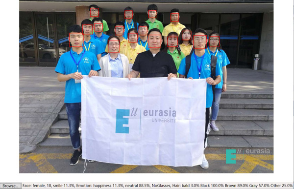 接下来就是人脸识别实验的操作,这个实验同样要基于Azure服务平台,同学们一步一步动手操作,尽管实验中遇到一些困难,但在老师的指导和其他同学的帮助下都迎刃而解。时间不长,大部分同学都已完成实验,真正意义上做到十五分钟,八行代码,玩转AI。实验效果不仅可以分析图片,识别全球各地的名人,还可以进行人脸情绪化辨识检测,识别视频中的人脸。同学们使用身边人图片进行验证,场面一度火热,实验中我们发现计算机在识别过程中还是有很多地方不准确的,老师告诉我们,要想做到精准无误,这需要AI做大量的训练。