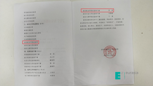 同时,今天下午3:00,2018年西安市雁塔区征兵工作会议在雁塔区人民武装部三楼会议室组织召开,我校再次荣获雁塔区人民武装部“2017年度征兵工作先进单位”荣誉和先进个人,这也是我校征兵工作连续三年获取此殊荣。