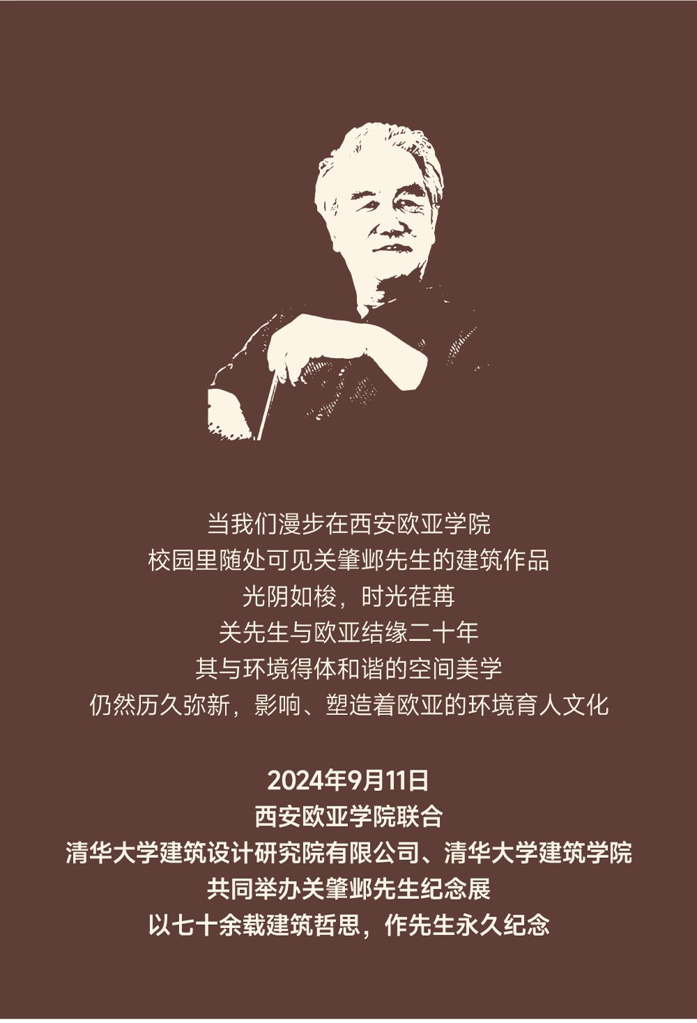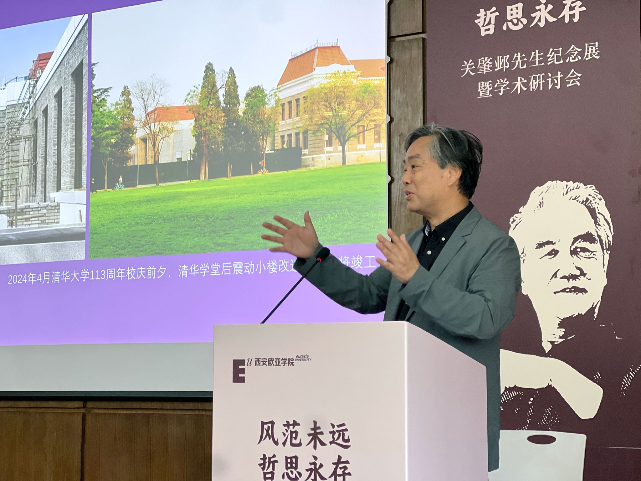 清华大学建筑设计研究院有限公司董事长、总建筑师刘玉龙在致辞时说:“关先生不仅是一位建筑师,一位建筑理论学家,他更是一位优秀的老师,关先生对待学生就像对待自己的孩子。昨天我来到欧亚已经晚上11点多了,我看见学校钟塔上的钟表还亮着,我就想到关先生就像指导我们的一盏明灯。校门口还特意放了两块牌子,一块是庆祝教师节,一块是关肇邺先生纪念展,我觉得这就是最好的纪念。”