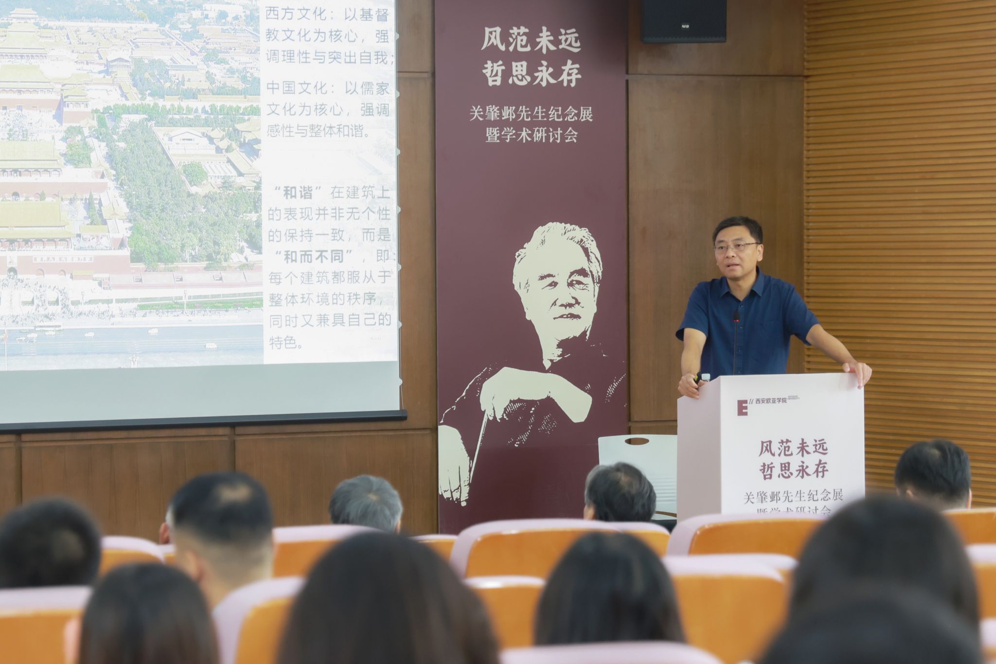 校园的蜕变是一所大学发展的缩影。胡建波以学校发展历程为切入,指出欧亚在步入规范发展期后,便立下两大愿景——建百年名校和为西安奉献人文景观。在此驱动下,他开始以高品质、高水准谋划校园建设,关肇邺先生和欧亚的故事亦徐徐展开:从2002年主持修建图书馆结缘,再到其走访校园时看到北区8号楼大厅(现为北A教学楼)、篮球场时发表的见解,再到设计大学生活动中心、学校东大门、南区教学楼、行政楼......10余年的时间,关肇邺先生不仅为欧亚建设出一批“和而不同”的教育建筑群,其“得体”的建筑哲思亦深刻影响着欧亚校园的建设。