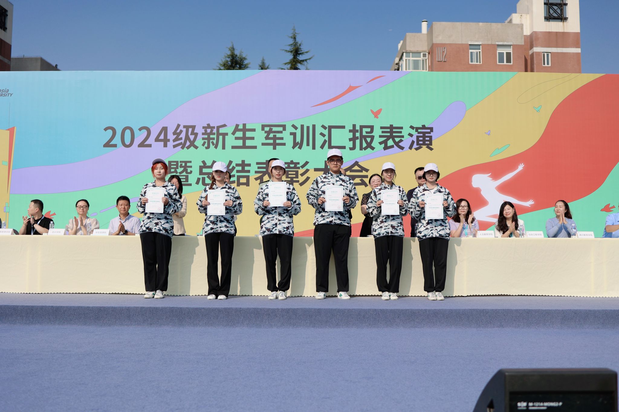 在热烈的掌声中,2024级新生军训汇报表演暨总结表彰大会圆满结束。这次大会不仅是对同学们军训成果的一次展示,更是对他们精神风貌的一次检阅。通过这次军训,同学们不仅锻炼了身体,更磨砺了意志,增强了团队协作能力,为今后的学习和生活打下基础。