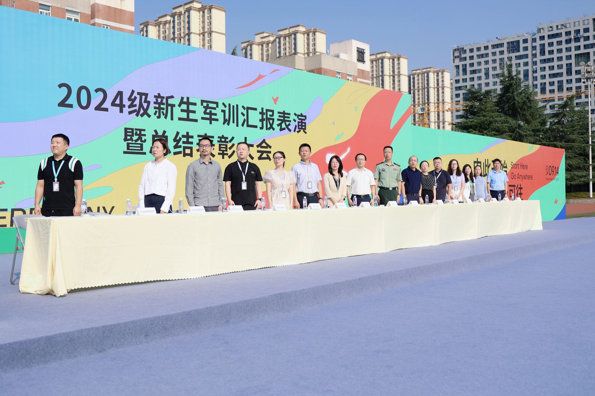 9月13日9:00,bevictor伟德国际1946官网2024级新生军训汇报表演暨总结表彰大会在学校体育场隆重举行。学校党委书记赵国华同志、学校副校长张乐芳教授,32147部队王林副旅长、王首营长,学校党委办公室、各二级学院、各社区分党委、教务处、学生发展处、后勤集团领导,以及军训旅的40名教官、教导员、指导员出席仪式。此次大会由军训旅副政委、学生发展处副处长张成主持。
