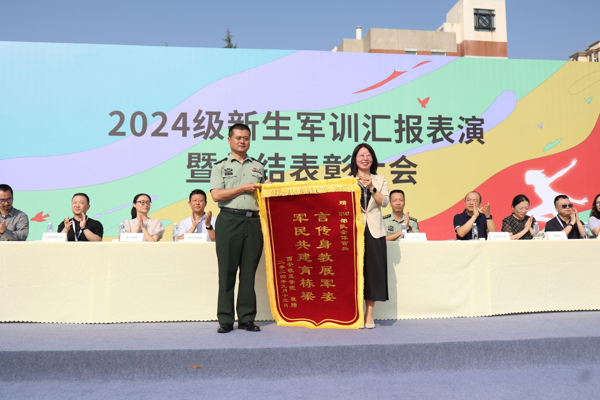 颁奖结束后,学校副校长张乐芳教授为32147部队赠送锦旗。她代表学校向全体教官的辛苦付出表示衷心感谢,感谢他们为同学们的成长和进步所做出的贡献。