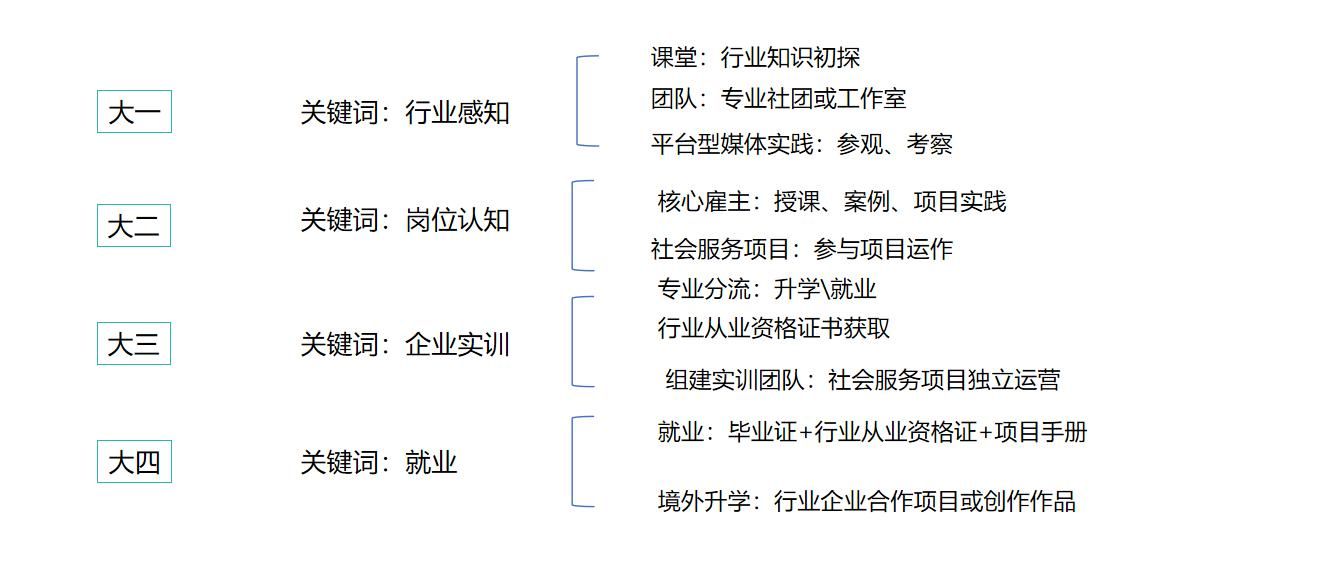 “以学生为中心的成长发展系统”是文化传媒学院的教育核心。在推动传媒教育革新的过程中,文化传媒学院制定了以雇主为导向的人才培养产教融合路径,构建伴随式教学实践模式。