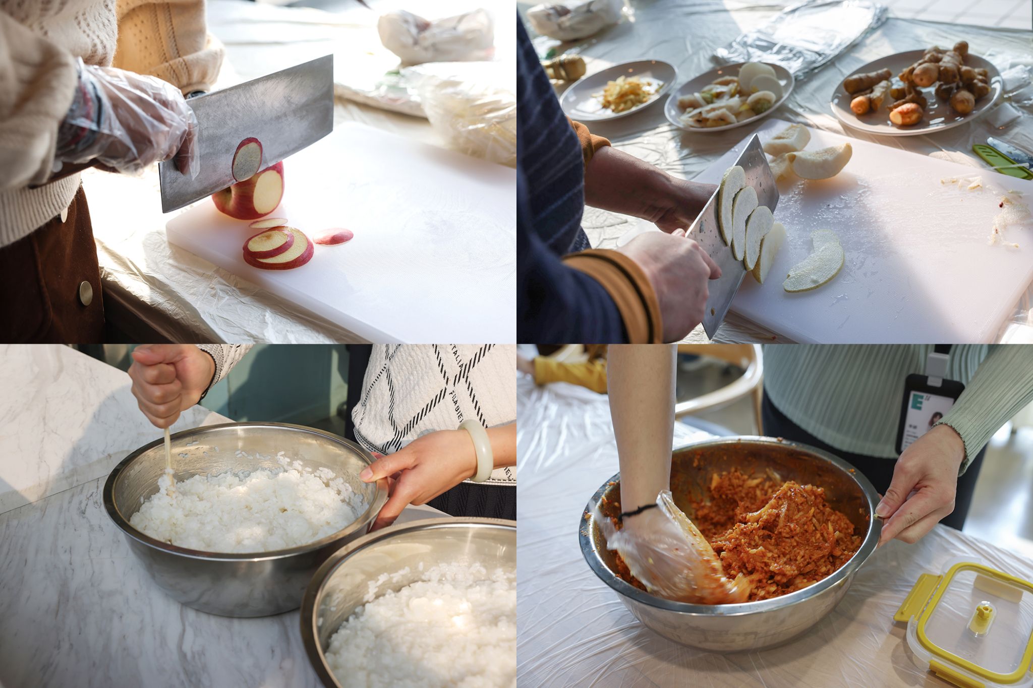 用清水洗干净浸泡了一天一夜的大白菜,拧干水分。白萝卜、梨与苹果切丝,和煮好的糯米、辣椒面混合,搅拌成丰富佐料,将其均匀涂抹在白菜正反两面后装瓶,等待20多天的自然发酵后,就可以食用了。