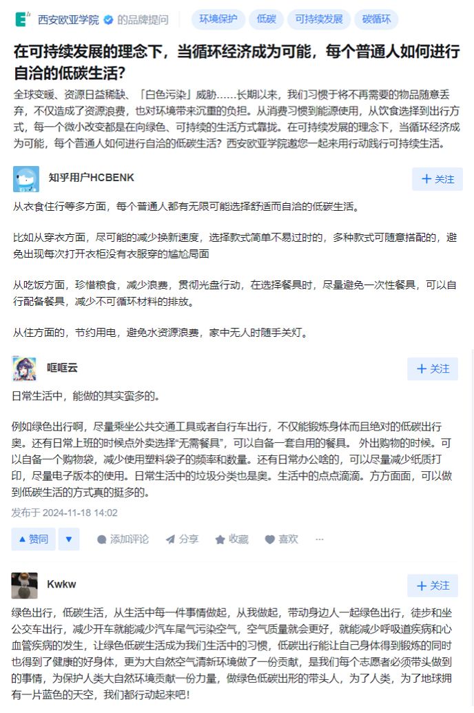 就像同学们在参与知乎摊位的环保问答中所写下的,“购物尽量随身携带布袋子,少用塑料袋“”饮食尽量选择堂食,少打包”“选择款式简单不易过时的衣服,减少换新速度”……每一个微小改变,都是在向绿色、可持续的生活方式靠拢。