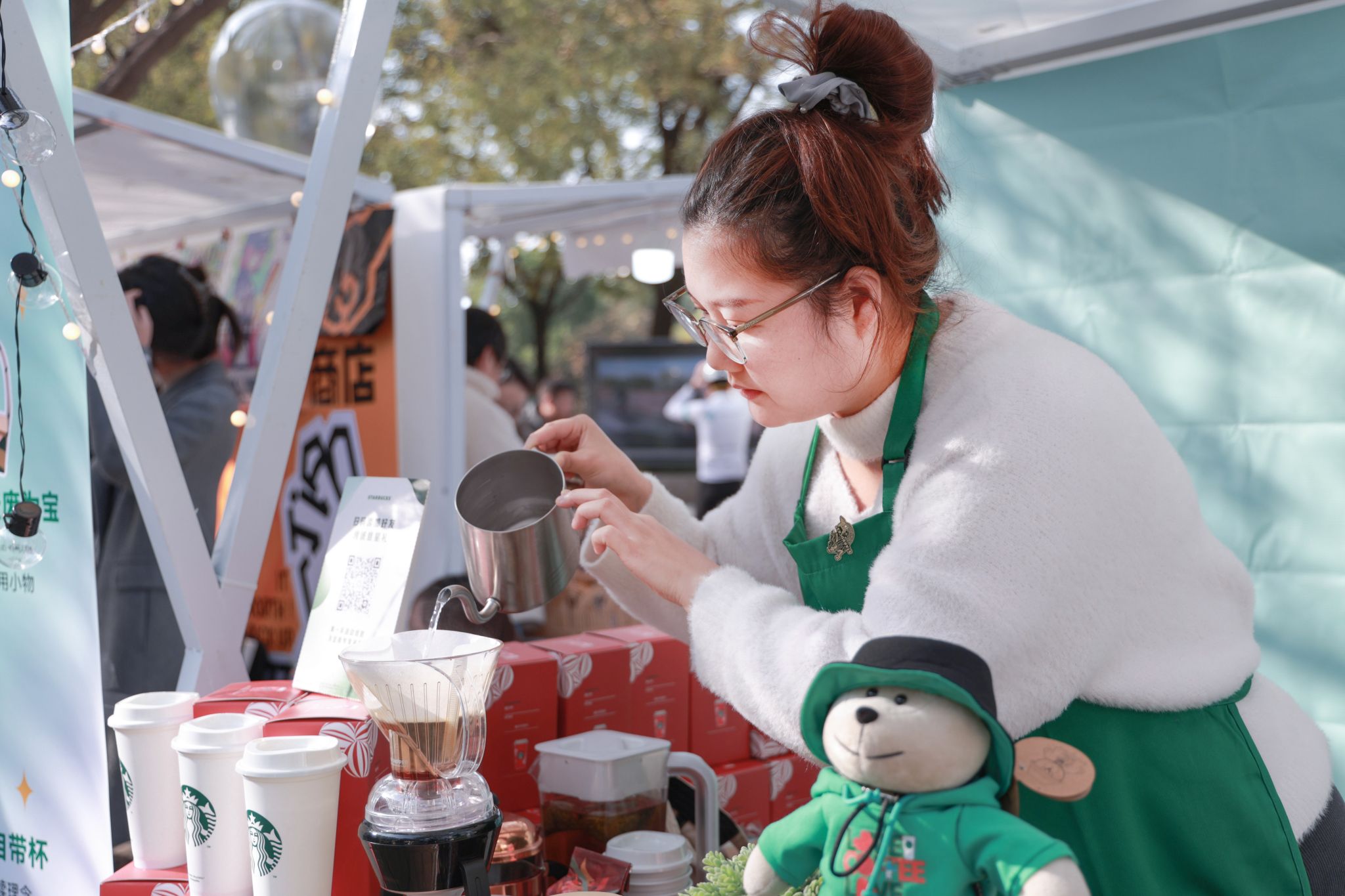 木漏日杂货摊主用老布料缝制的围巾、香囊、钱包颜值高又实用,深受大家喜爱;星巴克摊位前,工作人员正演示如何用咖啡渣灭烟、给植物施肥、自制身体磨砂膏;艾德艺术设计学院大三学生王慧勇自创的可持续品牌“捡值了”系列文创,还有大一新生在实践课程中利用宜家废旧沙发布套制作的可爱布偶、冰箱贴、胸针等生活小物件,都令人忍不住想多入手几件,将“绿色循环”穿戴在身上,带回家。