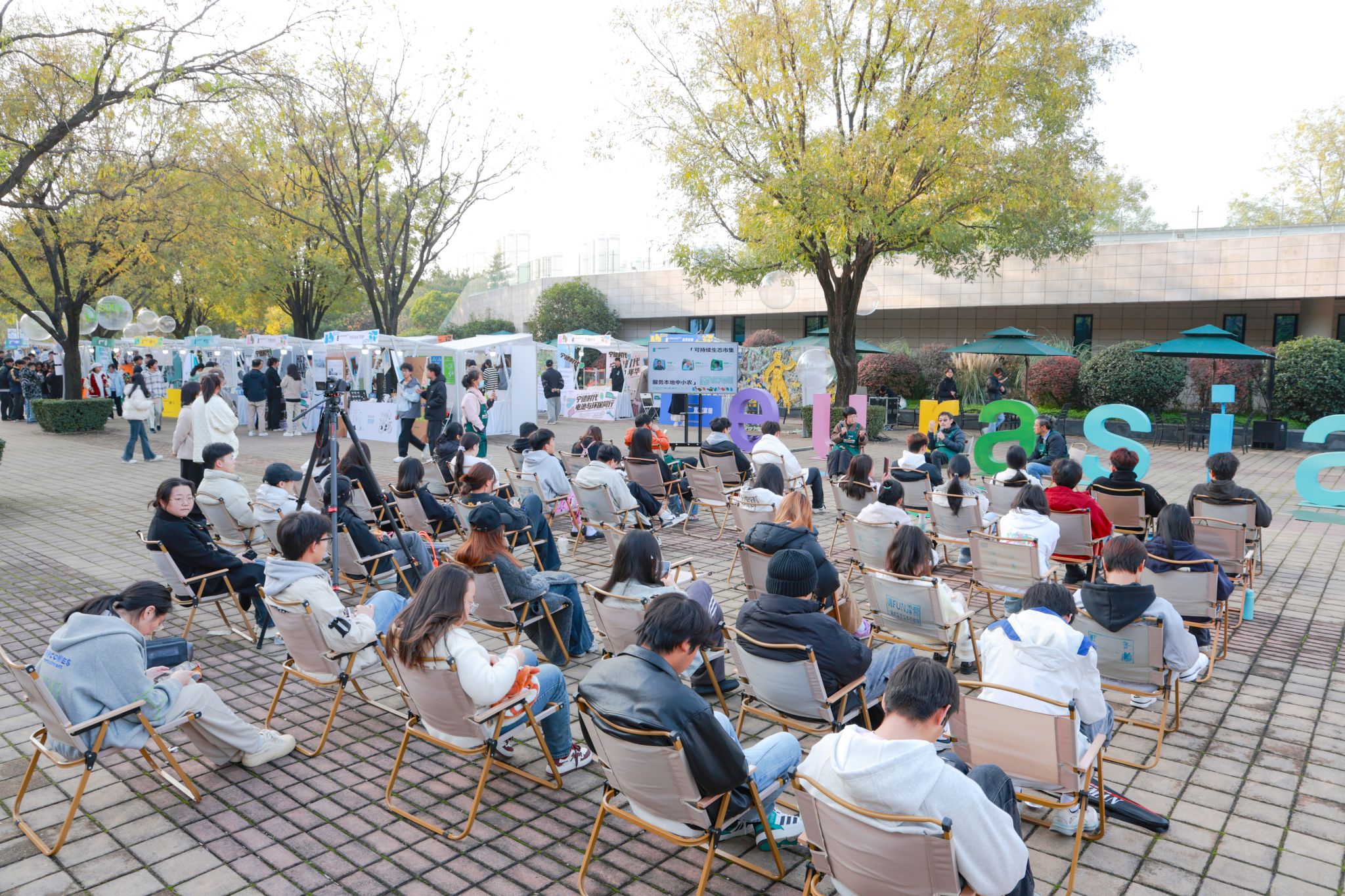 大学生活动中心广场,透明气球上印的“低碳出行“”慢生活“、废旧纸板上写的“爱土地,爱生活,爱自己”等字眼,吸引着过往师生驻足拍照,也成为欧亚可持续生活节期间被时常谈及和讨论的话题。