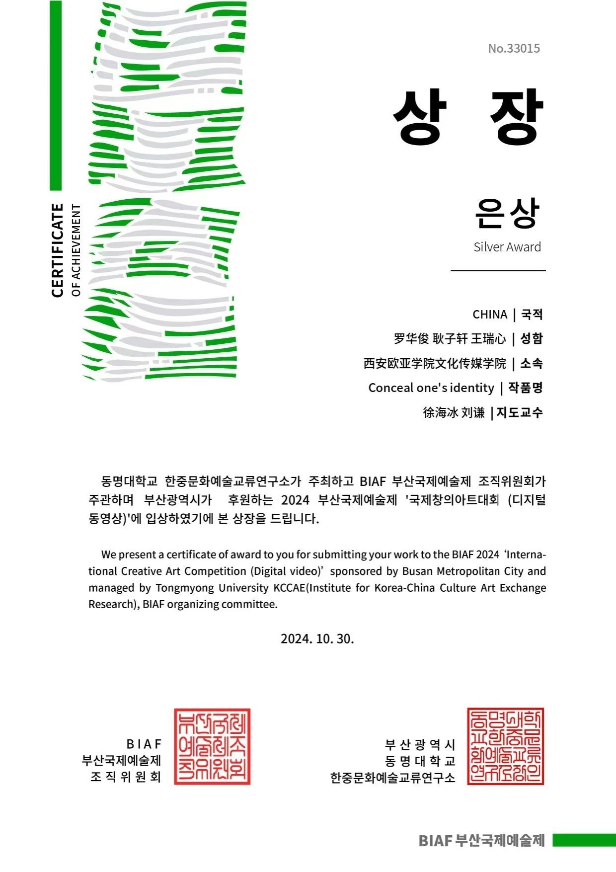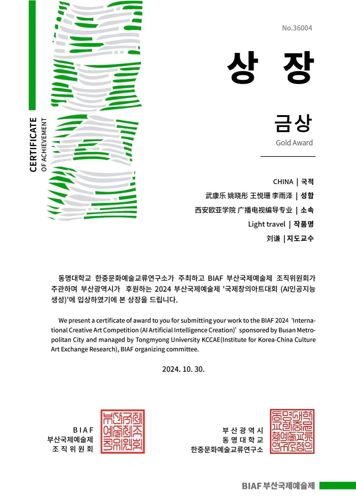 釜山国际艺术节(Busan International Art Festival,简称BIAF),是国际文明互鉴、文化交流的平台和桥梁。2024年10月30日,韩国釜山国际艺术节在釜山广域市厅展厅盛大开幕,主题是“美丽的未来”。在这个充满激情与创意的舞台上,来自全球70个国家的艺术家、创作者及艺术团体齐聚一堂,共有1122件作品脱颖而出。