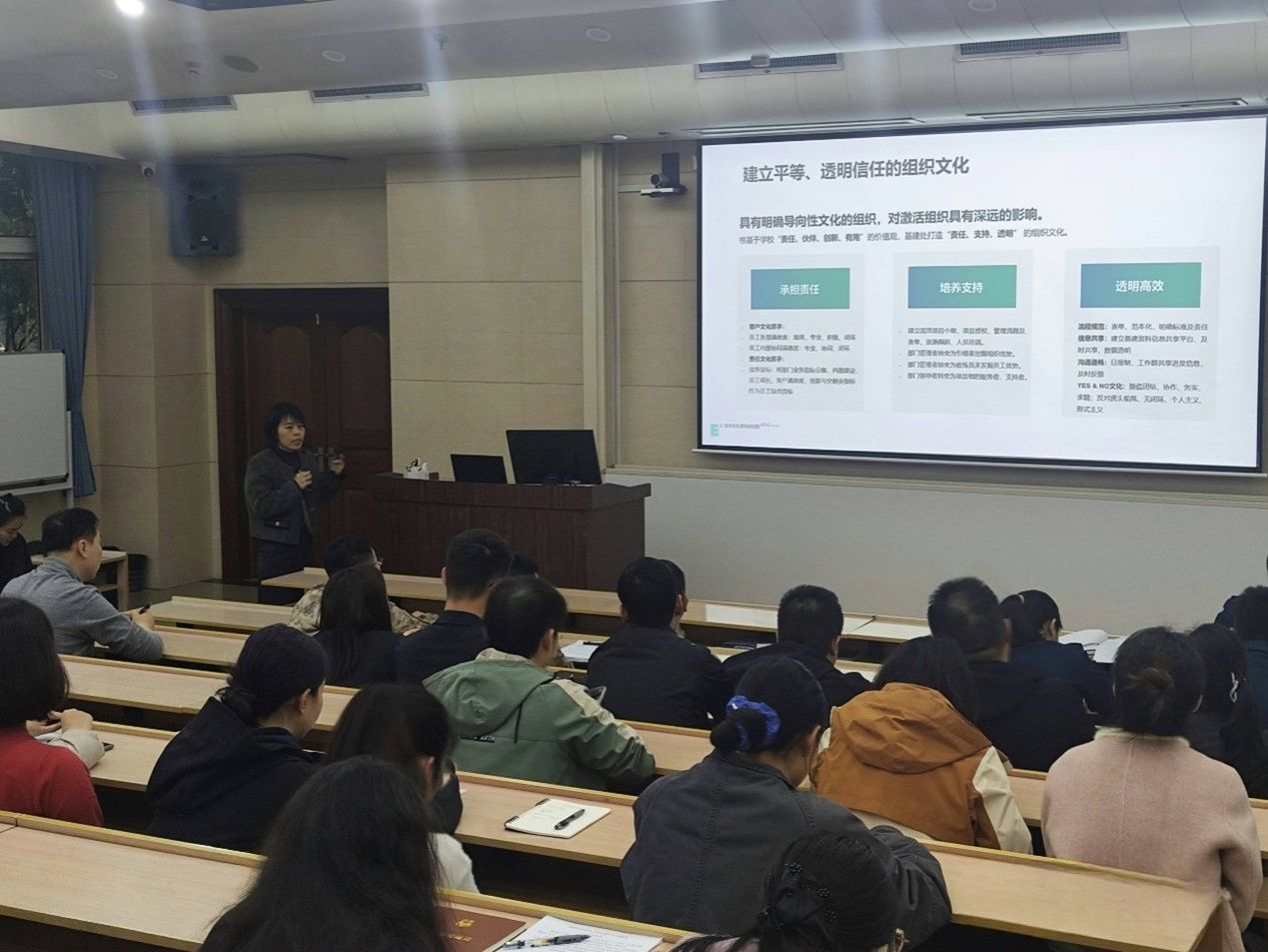 陕西馨迪景观装饰工程有限公司殷爱民分享了项目实操环节的图纸审核、材料选样、二次深化设计、质量通病防治等内容,深受西京医院项目管理人员的欢迎。