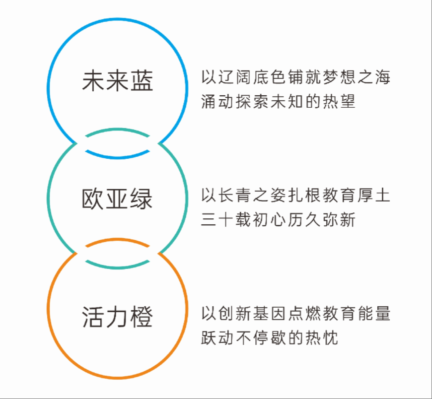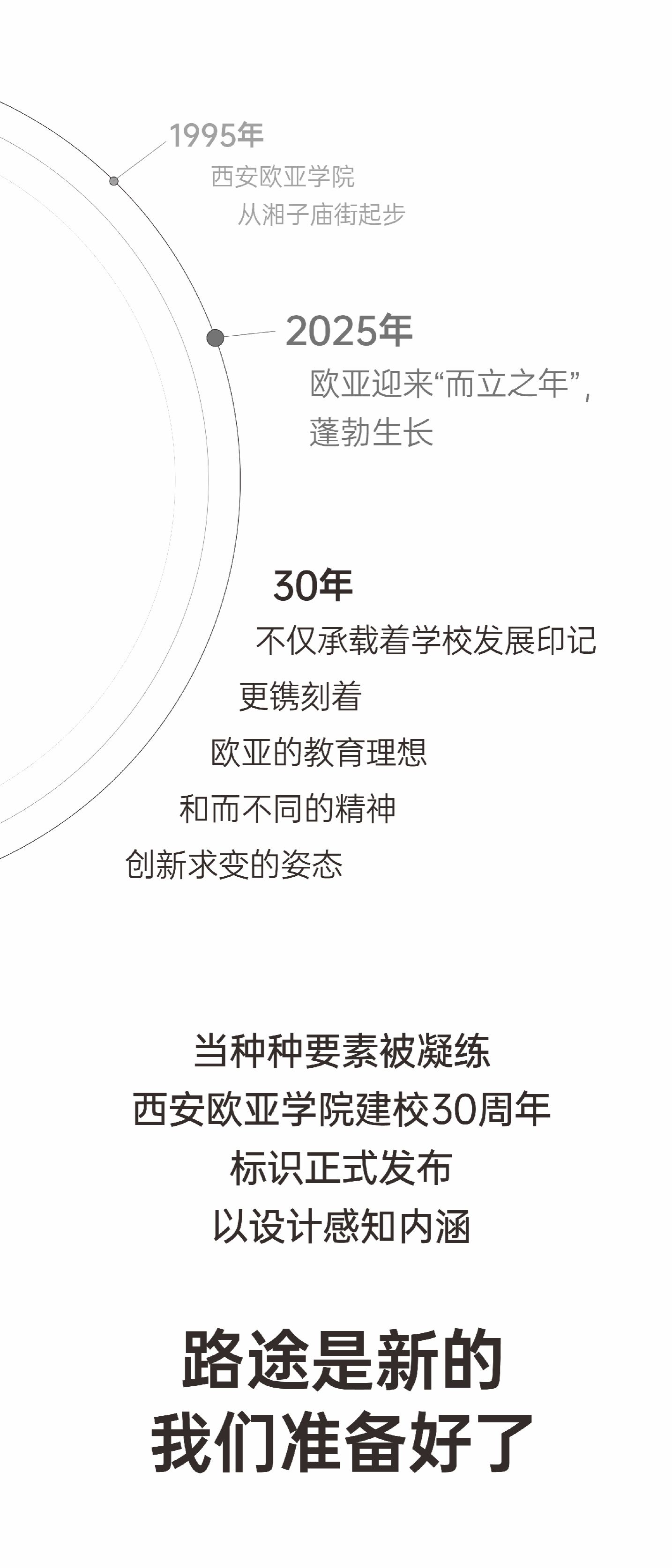 在整体建构上,标识去除不必要的设计,采用大片留白语言,让圆环的表达具备“打开与链接”之感。寓意面向新途,30岁的欧亚必将步履不停,在开放办学与产教融合的里程中,不断碰撞、不断联结,实现更为丰富的跨越与发展。