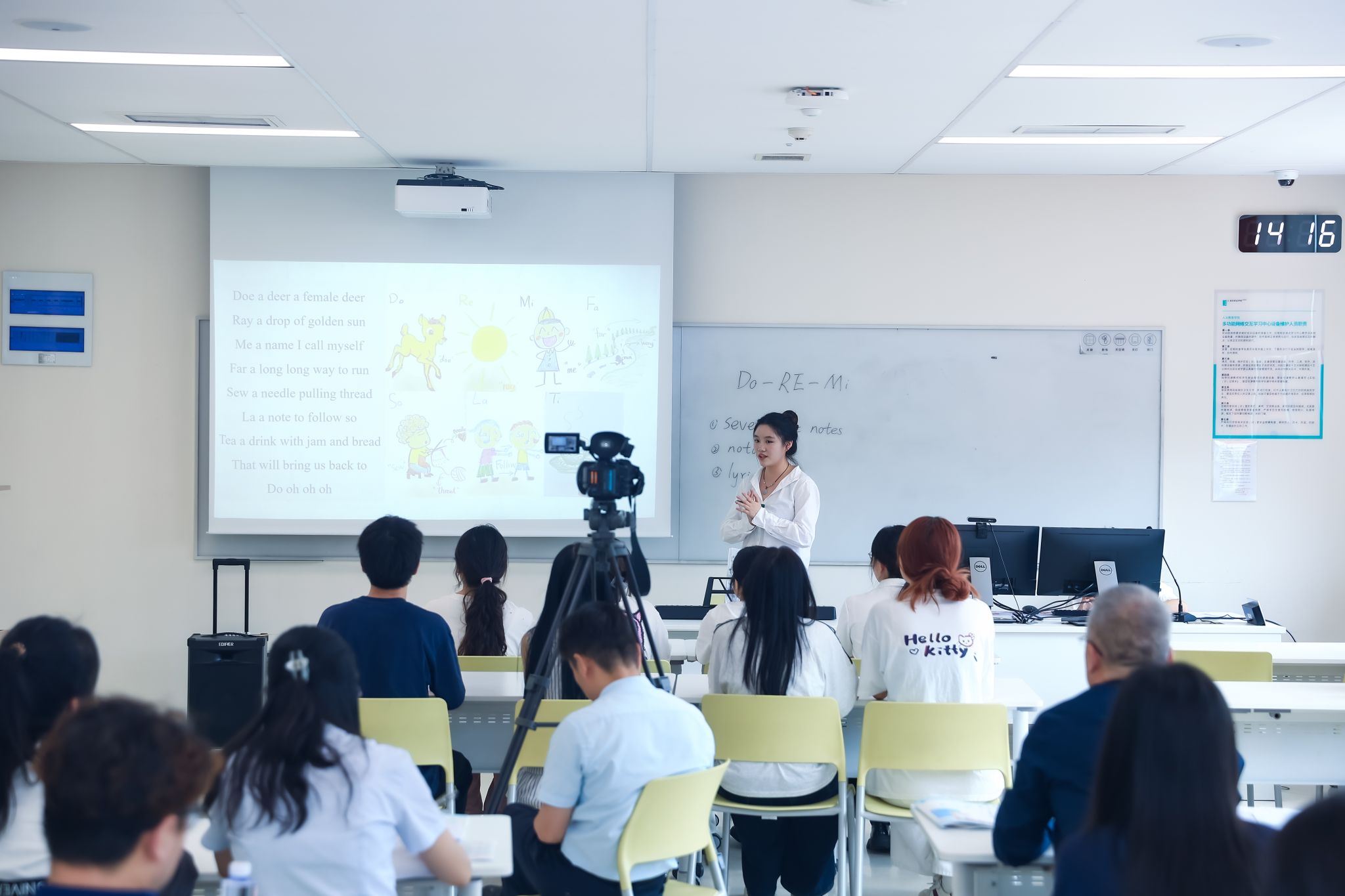 英语专业的同学则基于2024人教版小学英语新教材,尝试将英语+音乐/科学/中国文化/劳动进行跨学科融合,重新整体设计了儿童英语单元,并进行微型课试讲。33位来自一线中小学的嘉宾评委针对6个微型课进行了细致的点评和反馈。来自西安市高新区第六学校的史老师认为这几节课有趣又有效,尽显英语教学的灵动与温度。另一位一线教师则对于儿童英语课堂的舒适区与创新提出了自己的思考,引导同学们进行更多的尝试。