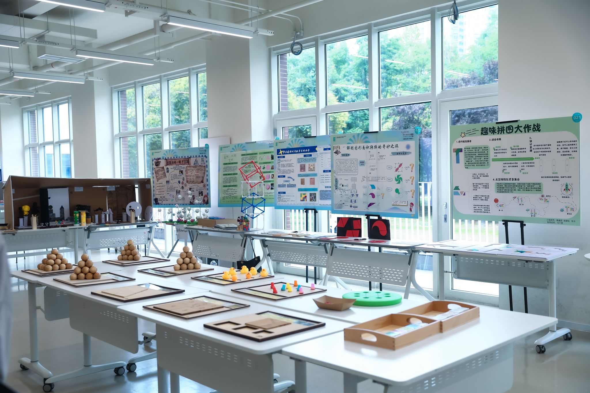数科乐育研究中心的展区,在美国哥伦比亚大学教育博士、台北教育大学教授张世宗的指导下,学生们深入剖析幼儿与小学阶段数科教育的特点及规律后,研发了22项“乐育”玩教具项目,作品涵盖数学和科学两方面内容,包括扑克牌、骰子、棋类、博弈等游戏,涉及几何拼图、勾股定律等内容。
