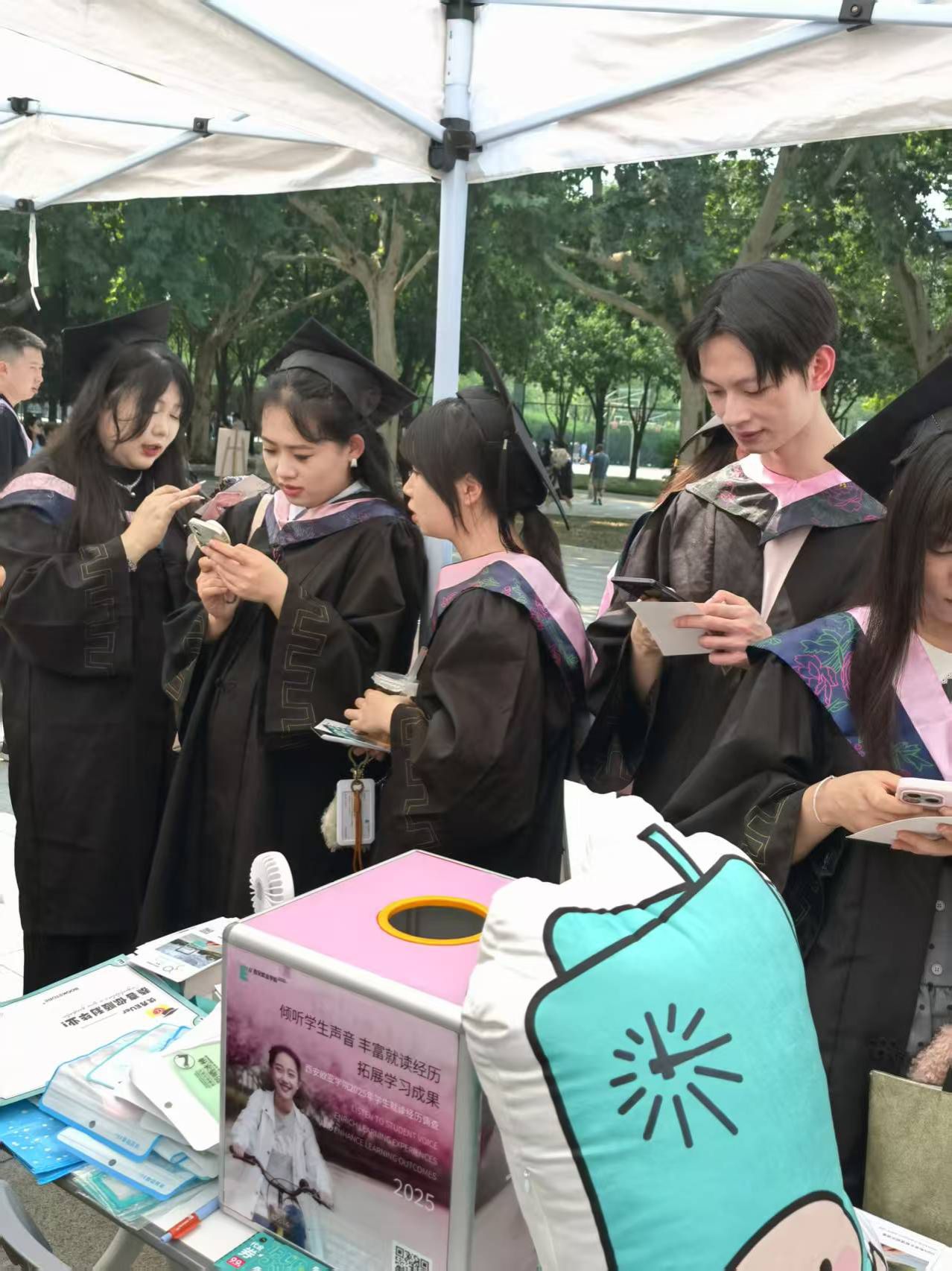 在随后的拨穗环节,温馨感人的互动场景接连上演。当毕业生们身着学士服,满怀感恩之情走上前时,部分毕业生特意停下脚步,向胡建波董事长分享对问卷项目的感受。一位毕业生激动地说:“感谢学校给我们学生一个表达的机会,我特别珍惜,特别认真地填写了问卷,希望学校能越来越好。” 质朴的话语,饱含着对母校的眷恋与期待。那一字一句间流淌的真挚情感,不仅叩击着在场每一个人的心门,更让我们项目组深刻意识到,这份调查承载的不仅是意见的收集,更是无数欧亚学子对母校未来的深情托付。