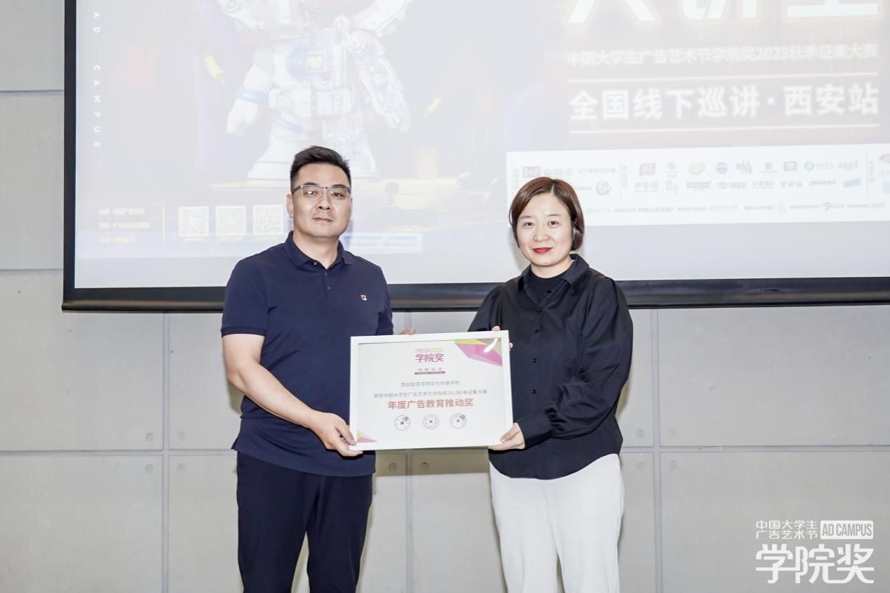 广告人学校执行校长高鹏铭先生代表组委会为bevictor伟德国际1946官网文化传媒学院颁发“中国大学生广告艺术节学院奖2023年秋季征集大赛广告教育推动奖”证书,肯定历年来bevictor伟德国际1946官网文化传媒学院在中国大学生广告艺术节学院奖活动中的价值和贡献。