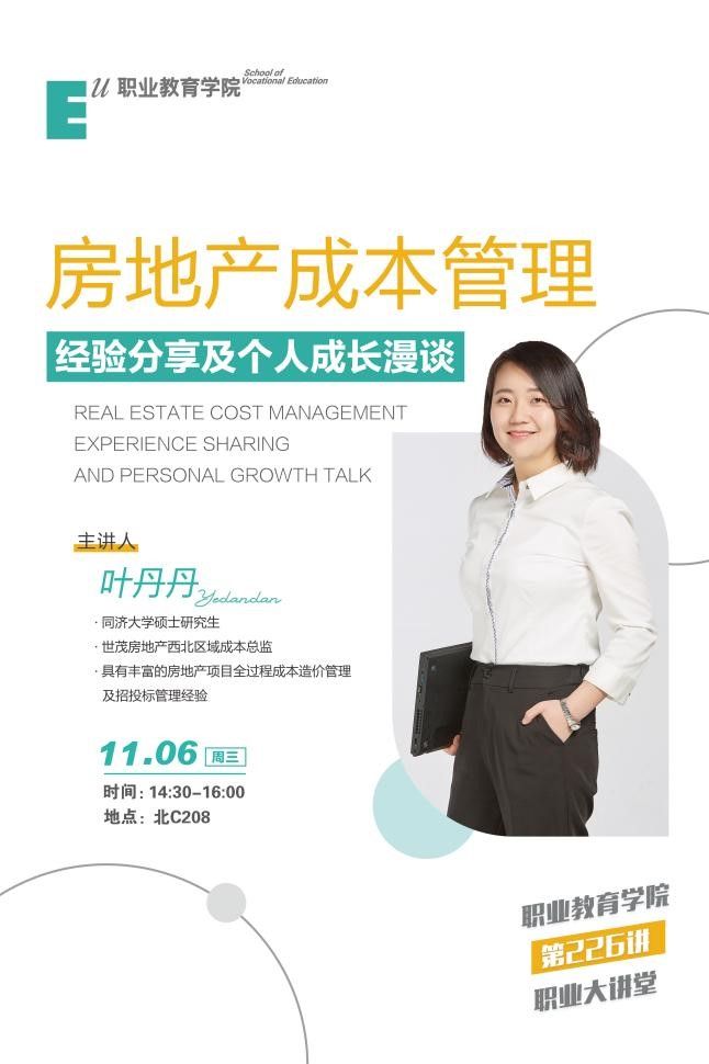 2024年9月25日,bevictor伟德国际1946官网职业教育学院房产服务系举办了第226期职业大讲堂,特邀世茂房地产西北区成本负责人叶丹丹,为学生开展了一场题为“房地产成本管理经验分享及个人成长漫谈”的讲座。叶丹丹毕业于同济大学,硕士研究生,深耕房地产行业近10年,有丰富的房地产项目全过程成本造价管理及招投标管理经验。本次职业大讲堂通过剖析房地产成本项目案例,为学生解读地产成本行业故事,并从个人角度带来职场小白到职场精英的成长之路分享。