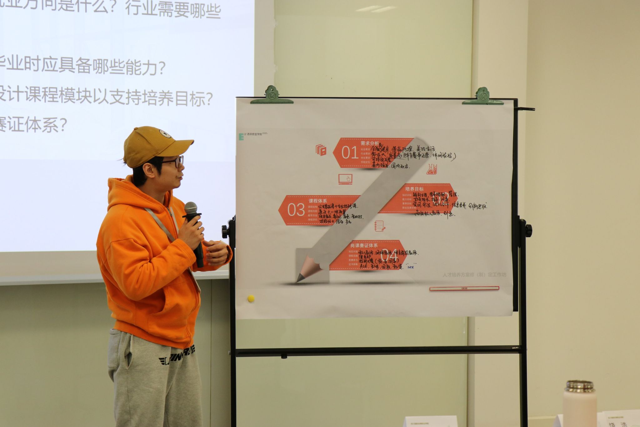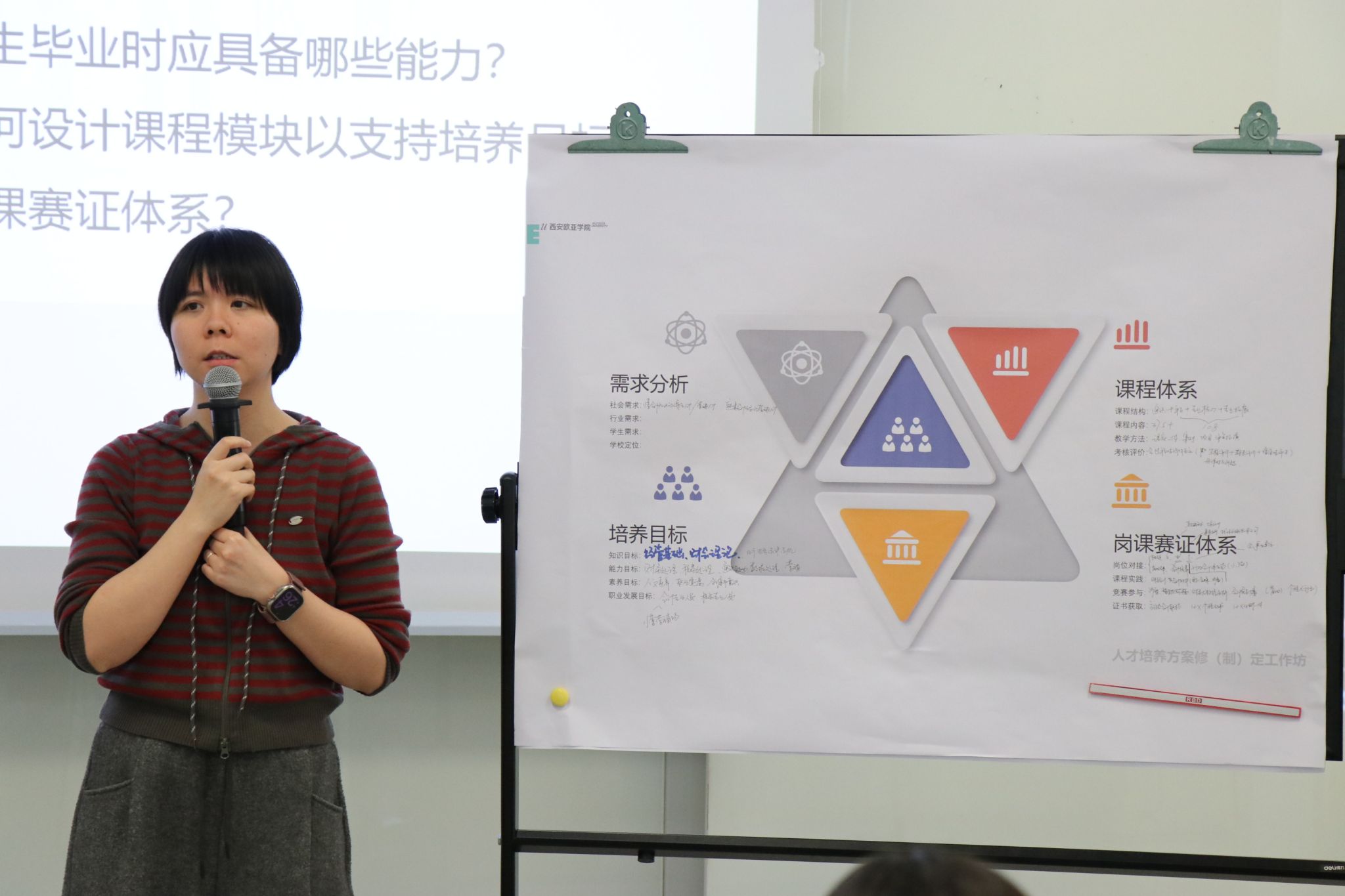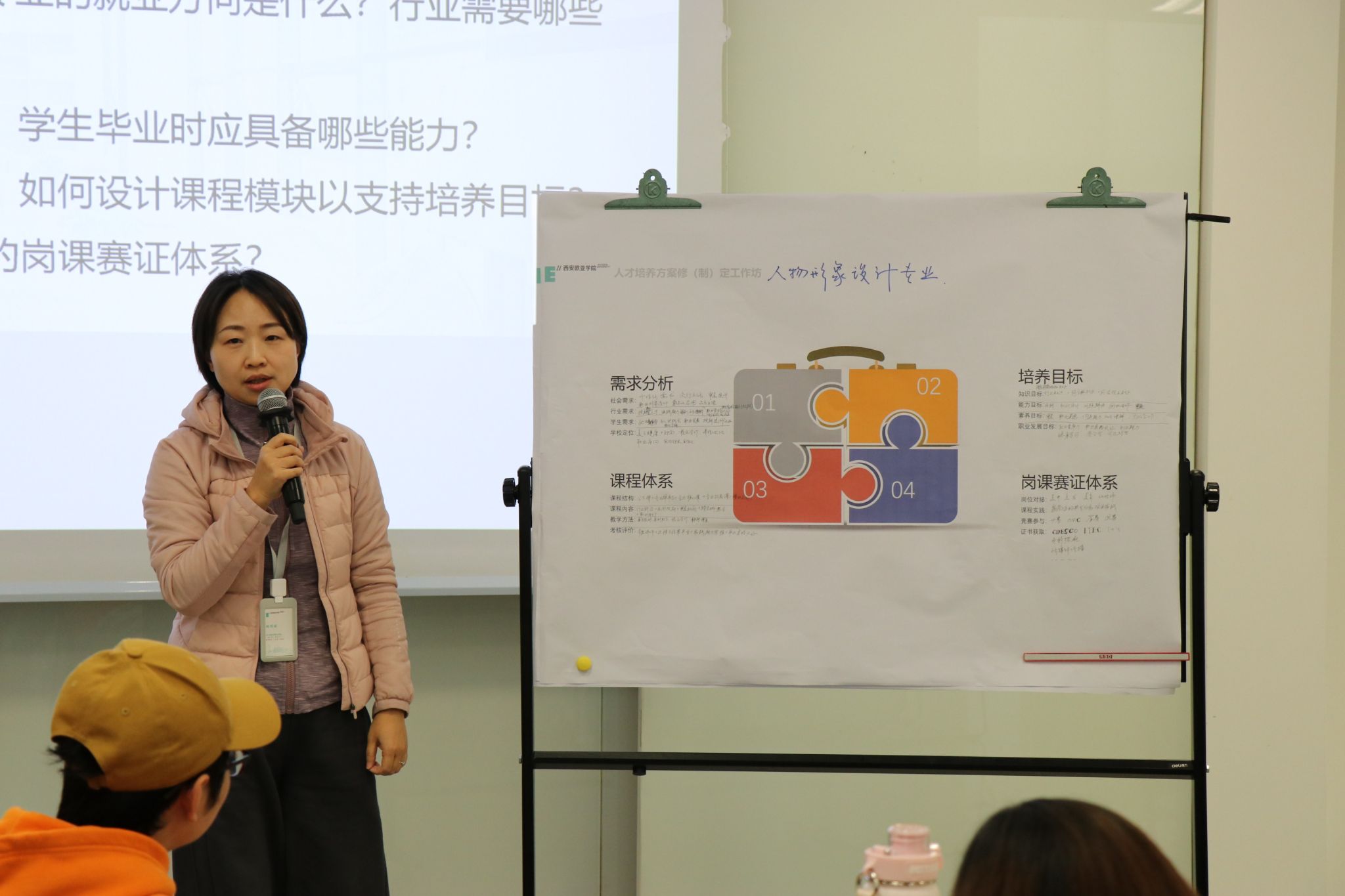 工作坊伊始,刘晓明老师引导参训教师分组梳理人才培养方案中的五大核心痛点(如课程滞后产业、实践教学薄弱、岗课赛融合不足等),刘晓明老师引导团队运用欧亚PBL工具包建立“问题-目标-路径”逻辑框架,明确修订方向。