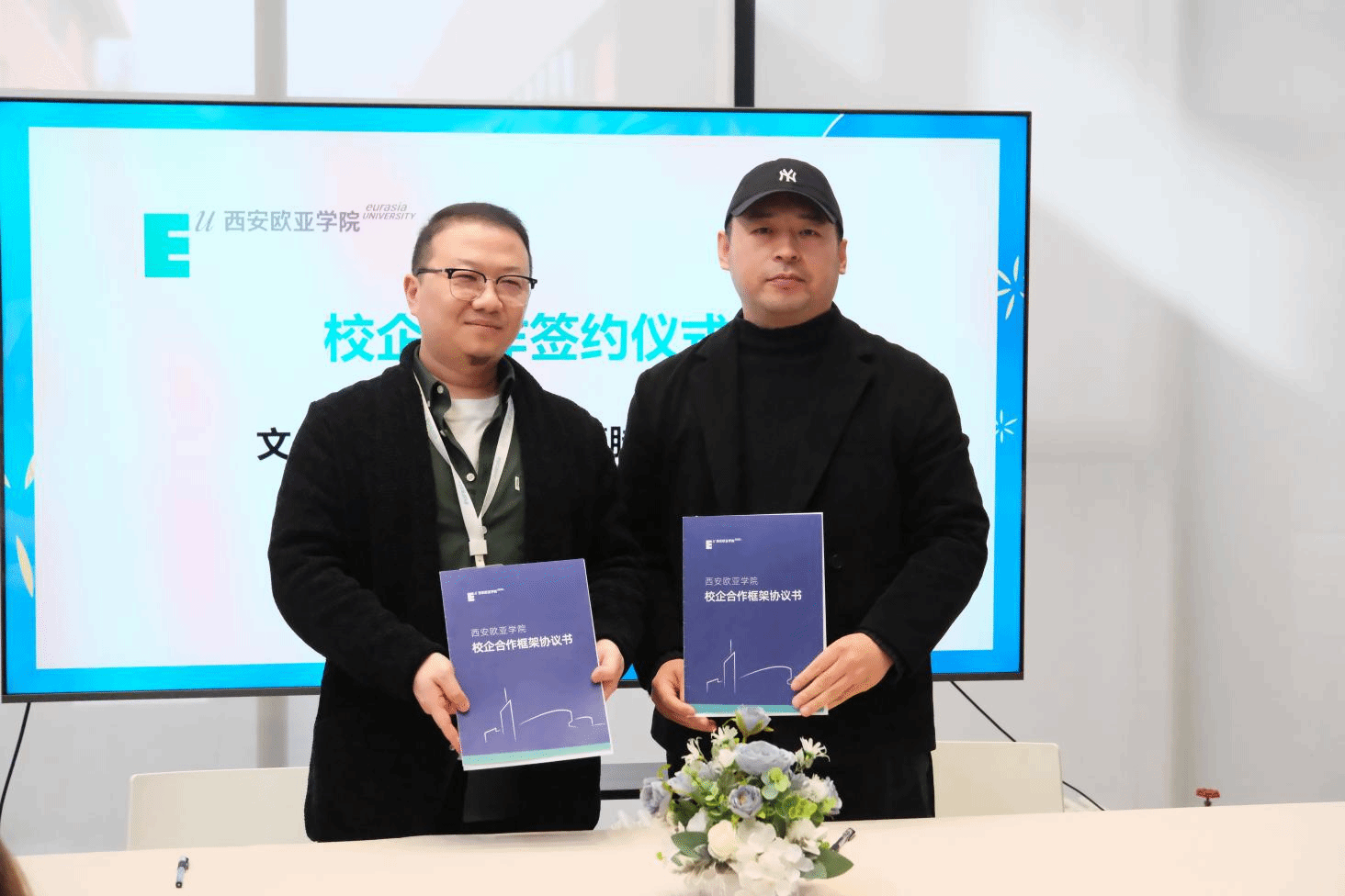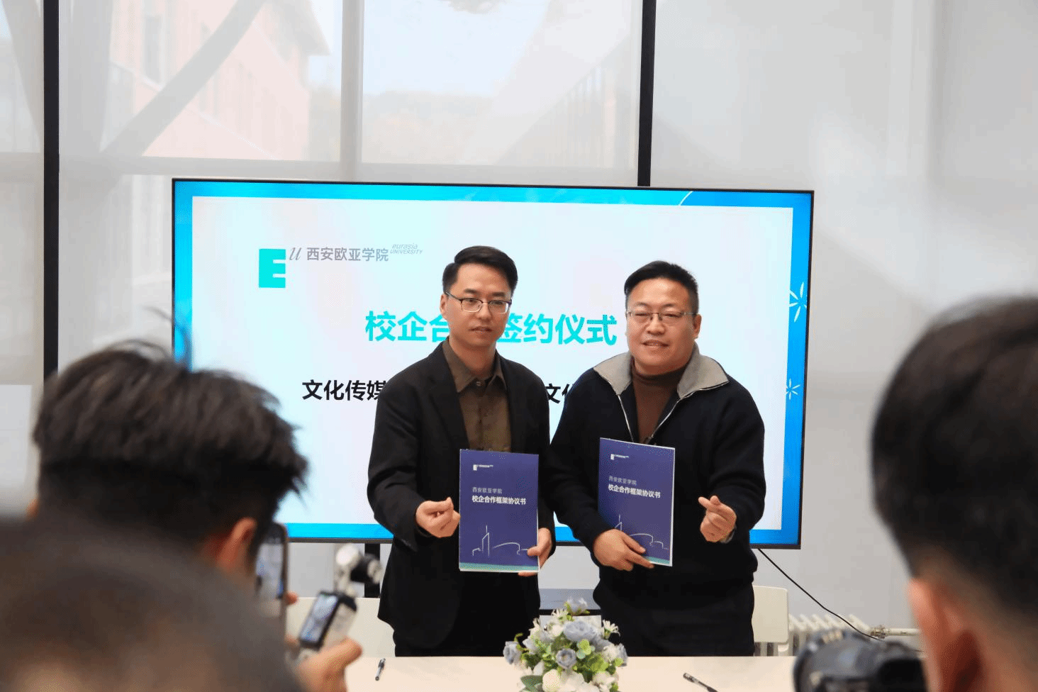 随后,在校企合作签约环节中,文化传媒学院院长助理雷方超和院长助理陈哲代表分院,与西安江湖映画动漫文化有限公司、西安九五天成文化传播有限公司、陕西乐颂文化传媒有限公司、陕西翰林文化发展有限公司、陕西商脉传媒有限公司、北京聪明核桃教育科技有限公司、旷世传声传媒科技集团共7家企业签署合作协议。