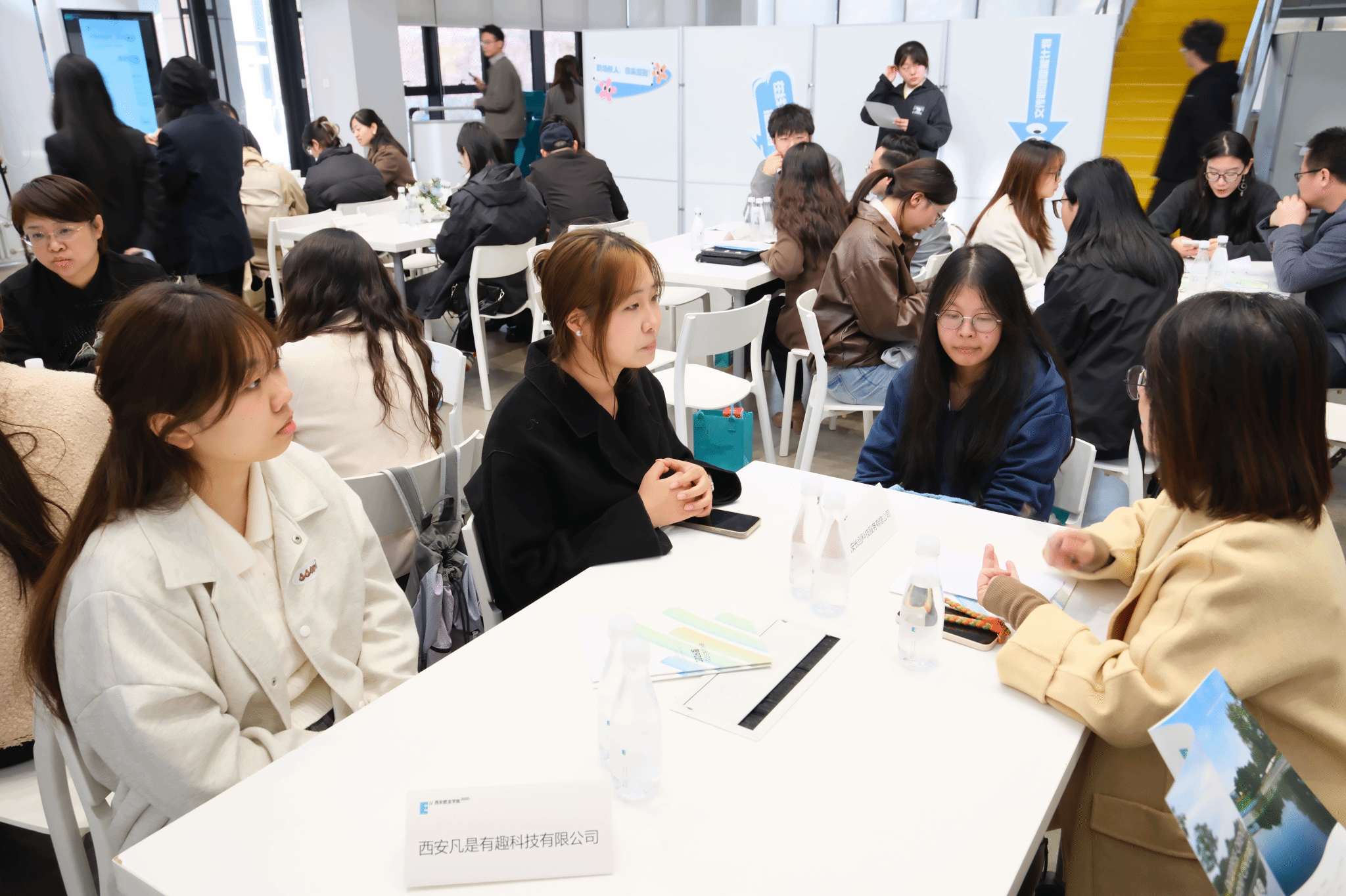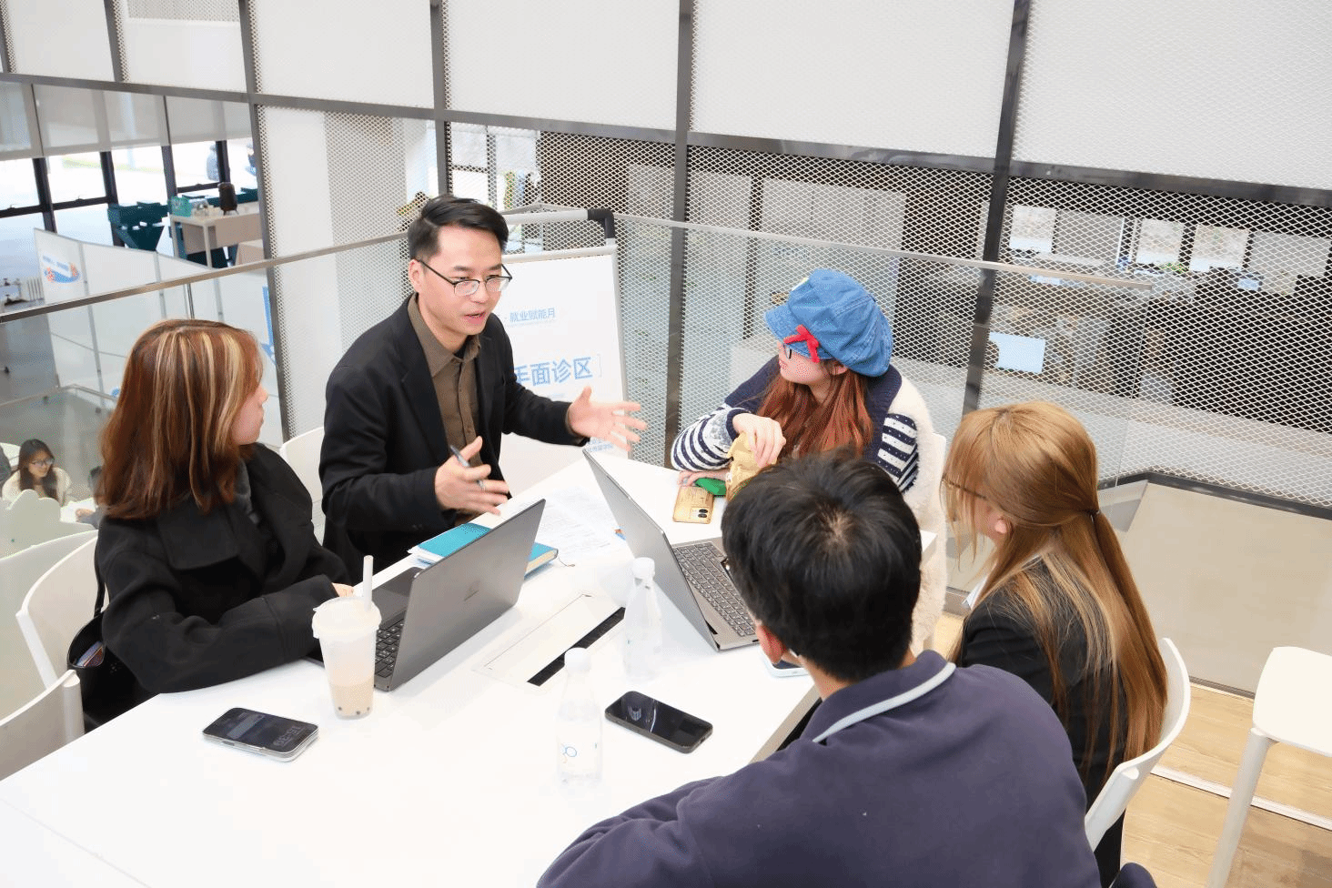 现场特别参照“世界咖啡”模式,创设“企业-专业教师-学生”三方圆桌对话场域,在轻松氛围中促成深度、交互式沟通,精准对接多方需求。不仅是求职平台,更成为即时赋能的成长课堂,众多同学在沉浸式洽谈与AI面诊中明确发展方向、收获宝贵机会,真正体验了一场“选择未来”的就业新场景。