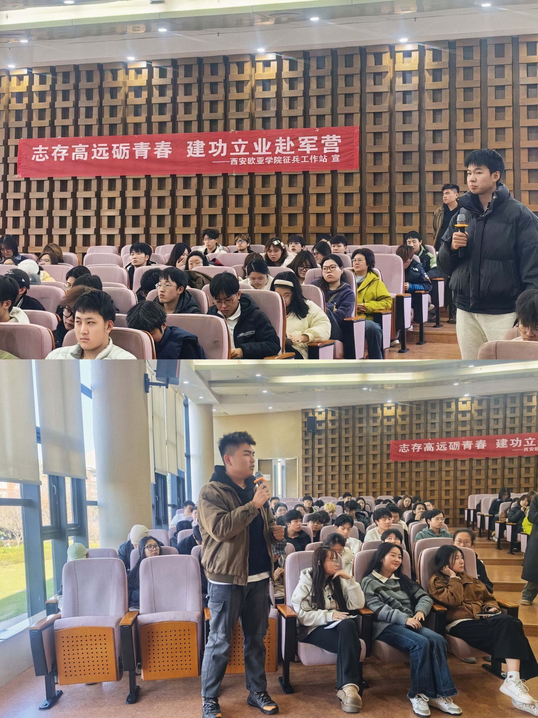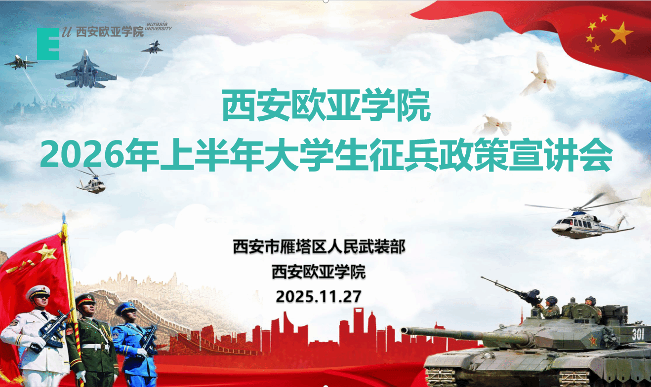 投身强军伟业,书写无悔青春,我校吹响2026年上半年征兵工作“集结号”,征兵报名通道已正式开启。此次宣讲会的成功举办,标志着我校新年度征兵工作已进入全面发力阶段。下一步,学校将坚决扛起为国防事业输送优质兵源的政治责任,加强顶层设计,强化部门协同,持续营造“参军光荣、入伍成才”的浓厚校园文化氛围,做实做细各项服务保障工作,引导更多优秀欧亚学子携笔从戎,在强军兴军的伟大征程中书写无愧于时代、无愧于青春的壮丽篇章,为巩固强大国防、实现中华民族伟大复兴的中国梦贡献欧亚力量!