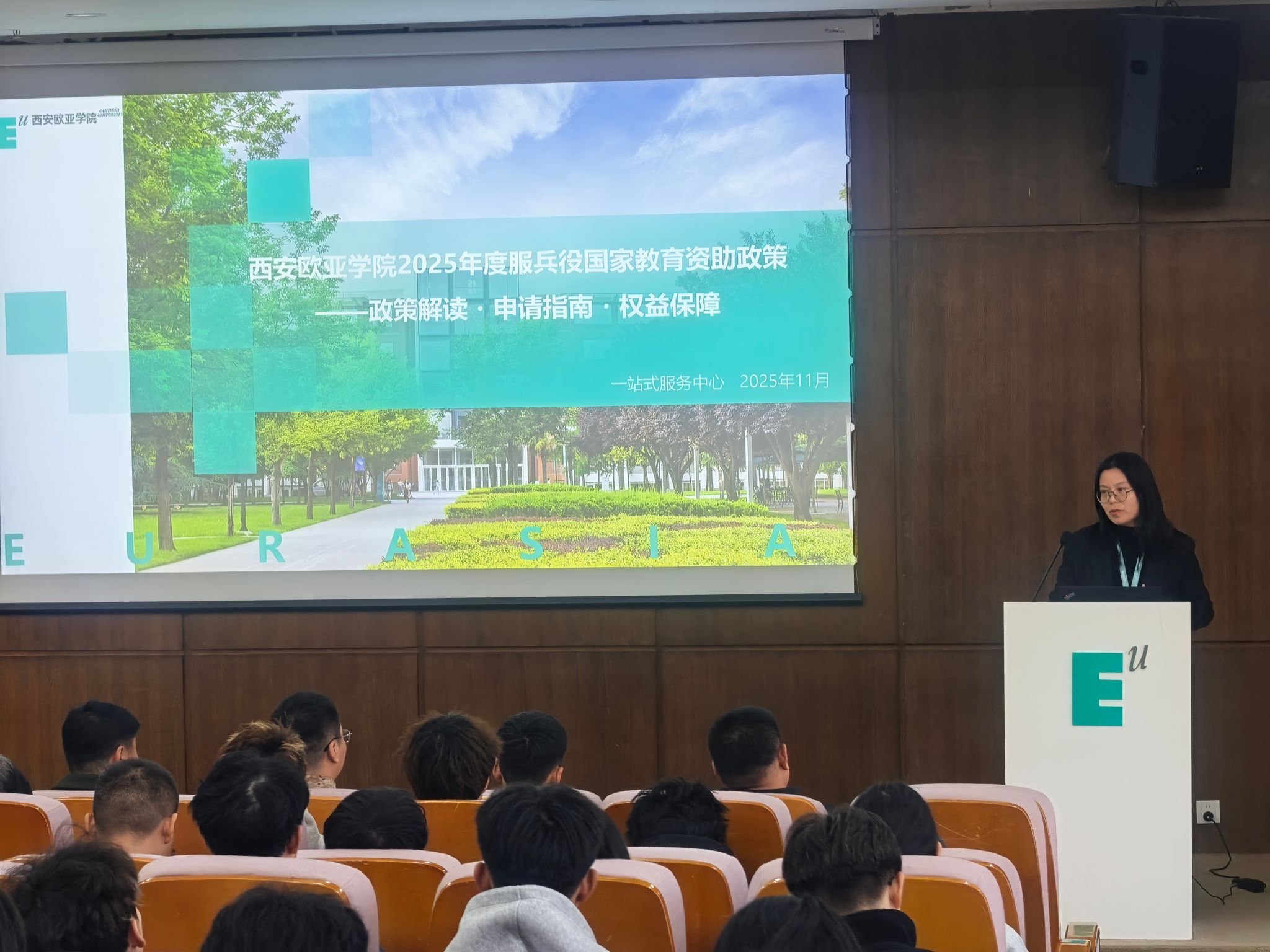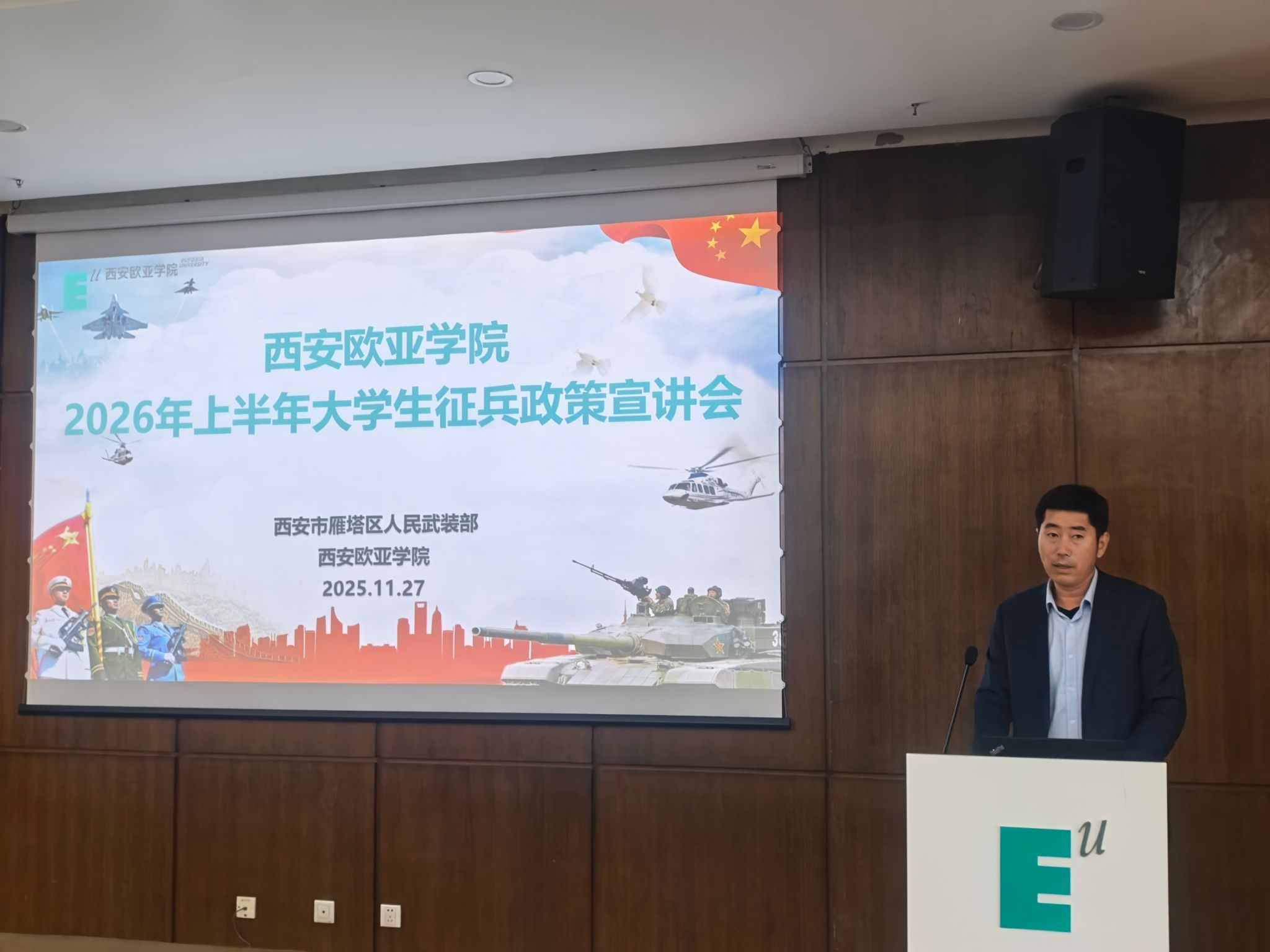下午2时30分,校稳定办常务副主任强建旗首先代表学校致辞。他站在服务国防和军队现代化建设、落实“为党育人、为国育才”初心使命的战略高度,对雁塔区人武部长期以来给予我校征兵工作的悉心指导与大力支持表示衷心感谢。在全面回顾和总结我校2025年征兵工作成效后,他向在场学子发出深情而有力的号召:“强国必先强军,强军必先强兵。人民军队正朝着建成世界一流军队的目标阔步前进,这为有理想、有学识、有担当的大学生提供了施展才华、建功立业的广阔舞台。希望欧亚学子能勇担历史重任,把个人理想融入强军实践,抓住时代机遇,积极应征入伍,让青春在火热的军营中淬炼成钢,让生命在为祖国和人民的奉献中焕发绚丽光彩。