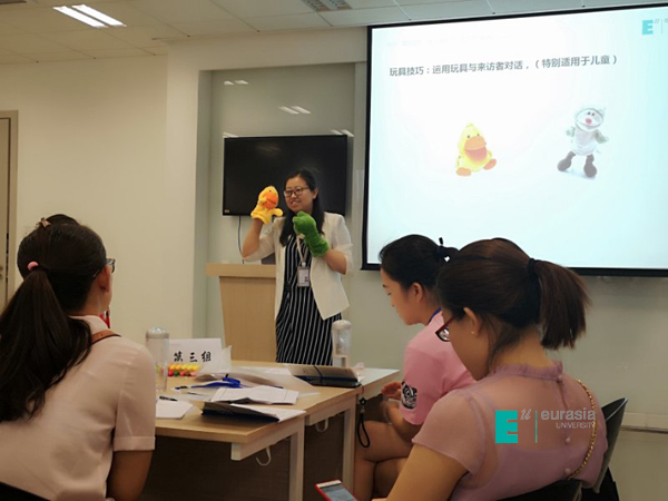 培训的第二天,在史娜老师的带领下,学员们一起感受到了团体心理辅导的魅力,了解了团体心理辅导的基本原理和操作,以及结合各自教学的实际经验设计了团体心理辅导的方案。通过大型的冥想练习和小组讨论以及别出心裁的“天使餐”,让学员们在感受团体动力的同时,增进了对自身的觉察。要想帮助别人,先要看清自己,有位学员在团辅中分享到:这个活动让我感觉到我以前好像一直都没有好好爱自己,感觉以后应该对自己有更多的关注和爱护。还有的学员说,团体辅导的方式在中小学很适用,不仅对学生,对于我们教师的减压和自我成长也有帮助。