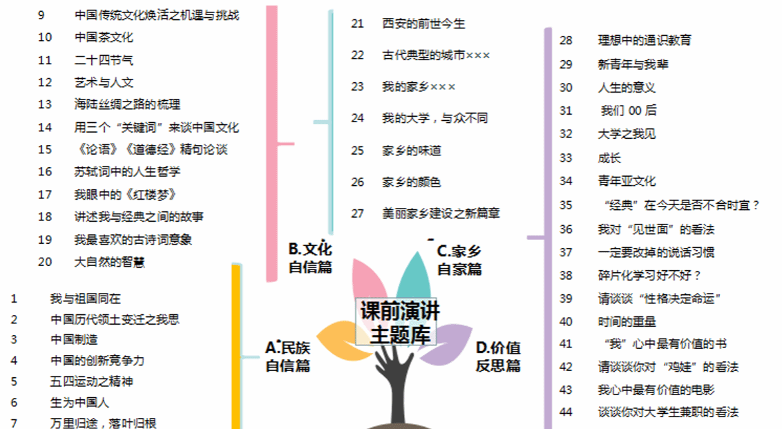 ③ 教学案例及其他资源库建设:建立了系统课程思政教学案例库、课前演讲主题库、85种阅读材料库(含视频材料)。课程思政教学案例服务于教师教学,挖掘人文学科思政元素,提升课程思政育人功能;课前演讲主题库服务于学生公众演讲,提高表达自信力,85种阅读材料服务于课中深度探究及课后阅读参考。