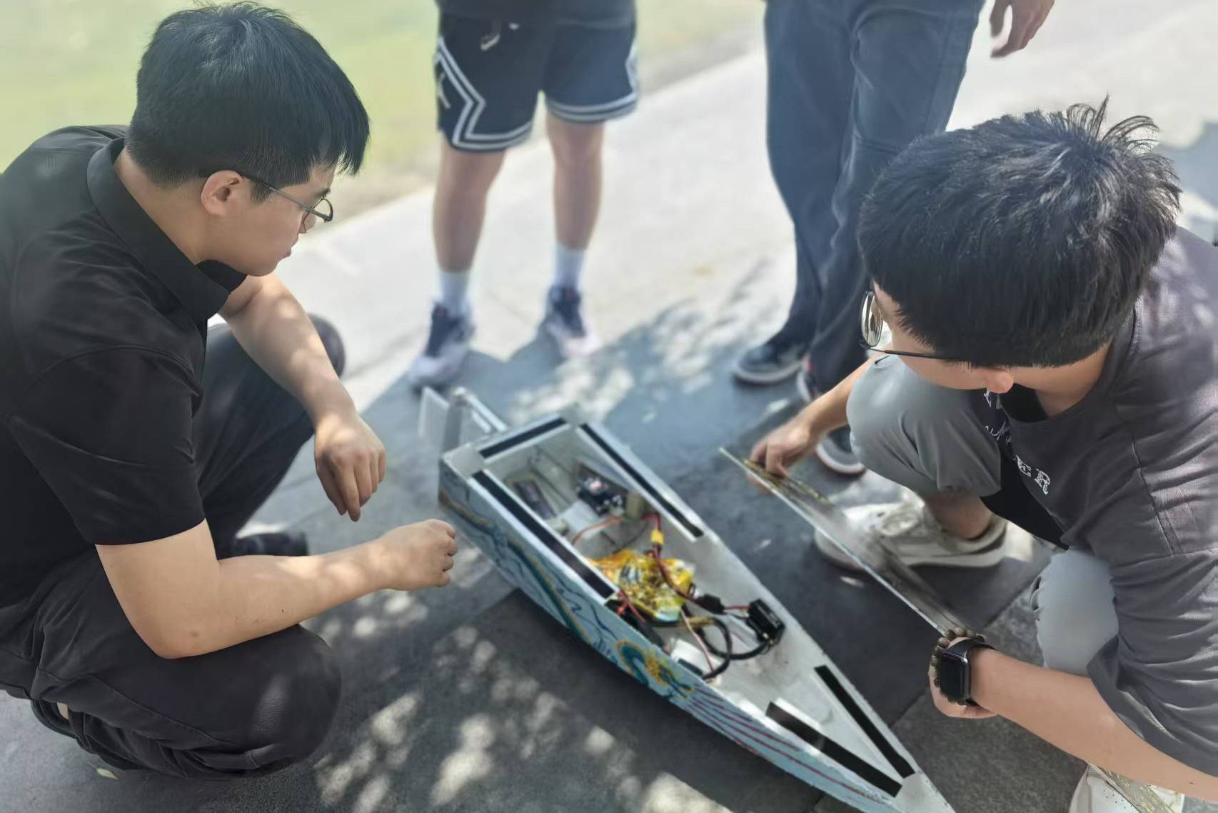 薛圣泽(左一)在混凝土龙舟项目式课堂中指导学生