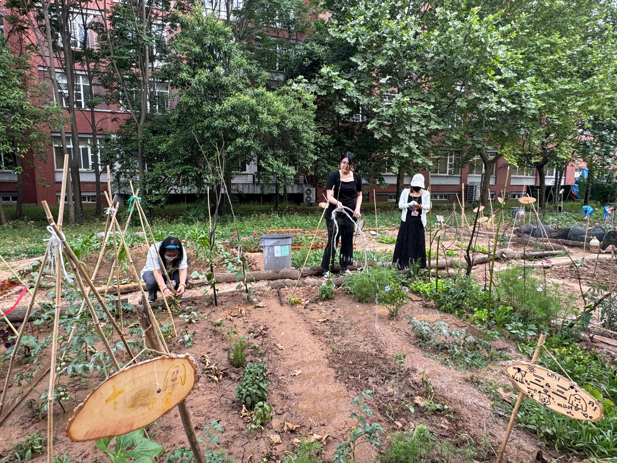 “令我印象特别深刻的是班上有几名男生特别喜欢自己的菜园,他们组成‘开垦小队’,想要种植红薯等根茎类植物,需要挖大坑。但是后来发现这块土地十分匮乏,需要进行培育养护。北E楼前高大的松树下因长期掉落松果与松针,积攒了一层厚厚的草木灰,他们将草木灰逐箱挖掘并与土地混合,给予土地肥沃的养料。”刘念第一次感受到学生们对土地的用心管理与热爱。