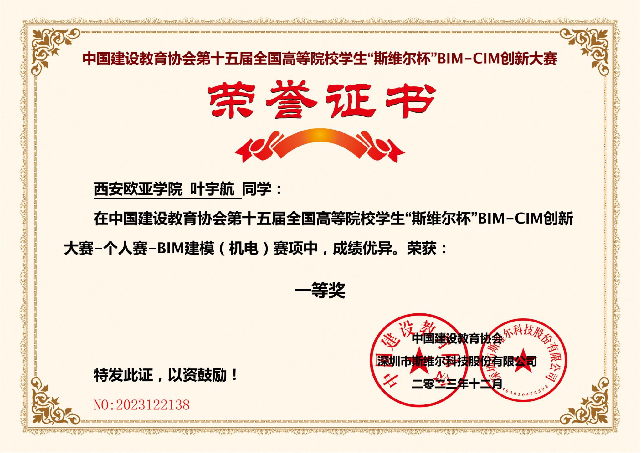 大二下学期,在堪称土木类"奥林匹克"的第十六届“高教杯”全国大学生先进成图技术与产品信息建模创新大赛中,他需要在3小时内完成1万平米体育馆的16张专业图纸建模。从校赛168人中突围而出,到斩获省赛一等奖,再到28天国赛倒计时,叶宇航每天泡在BIM工作室,上B站看教学视频,买淘宝课程学习,不懂就追着学长学姐问……走火入魔式地专注准备,最终他捧回了建筑类个人全能三等奖。