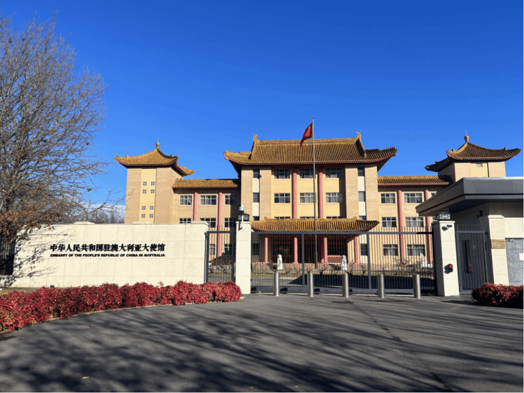 参观完国会大厦的内部装潢与艺术文化气息之后,同学们又转站来到了使馆区(Embassy District)中华人民共和国驻澳大利亚联邦大使馆位于澳大利亚堪培拉亚拉伦拉区加冕大道15号(15 Coronation Drive, Yarralumla, ACT 2600, Australia)。大使馆北临Burley Griffin湖,南眺澳大利亚议会大厦,占地21628平方米,建筑面积为7000平方米。