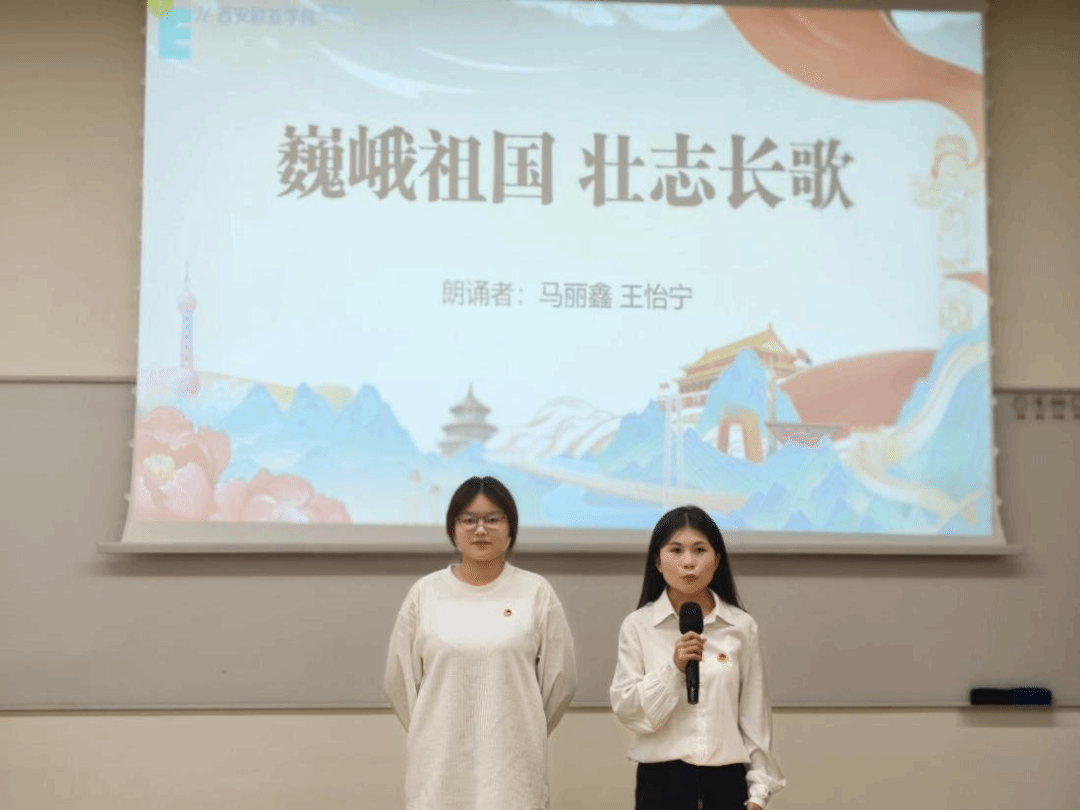 马丽鑫、王怡宁、曹金花、赵晨晖、张晴本次活动不仅表达了同学们对祖国母亲的无限热爱与祝福,更激发了我们年轻一代的责任感和使命感。用自己的声音,带来一场视听盛宴,在朗诵的海洋中遨游,共同感受那份来自心底的震撼与感动。