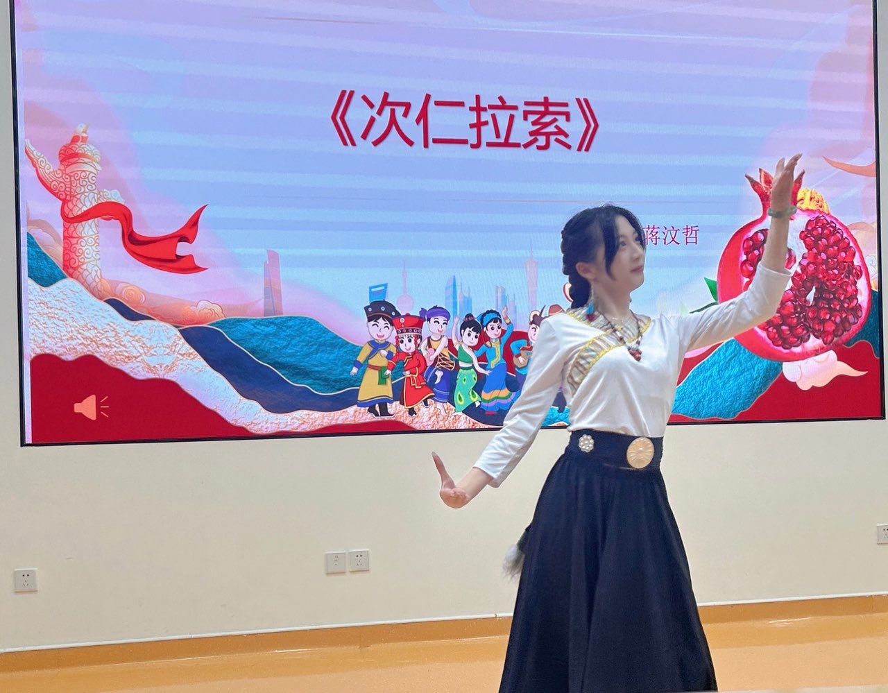 交流活动在沈昊雪同学的古筝演奏《战台风》中拉开帷幕。在本次民族文化交流活动中,各民族的文化百花齐放,美轮美奂,色彩纷呈。高子涵同学的维吾尔族舞蹈《一杯美酒》热烈奔放,婉转悠扬,展现了维吾尔族热情和大方;李晓蓉同学的苗族舞蹈《苗族山歌》轻盈灵动,妩媚俏皮,每一个动作都蕴含着苗族舞蹈的优美;赵丹甄同学的蒙古族舞蹈《云登哥哥》,将广袤草原的奔放展现得淋漓尽致;何茜同学的彝族舞蹈《弥渡山歌》轻盈柔美,热情洋溢;蒋汶哲同学的藏族舞蹈《次仁拉索》,纯净自然,耐人寻味。各族舞蹈大放异彩,紧紧的吸引了现场观众的注目,掌声此起彼伏。