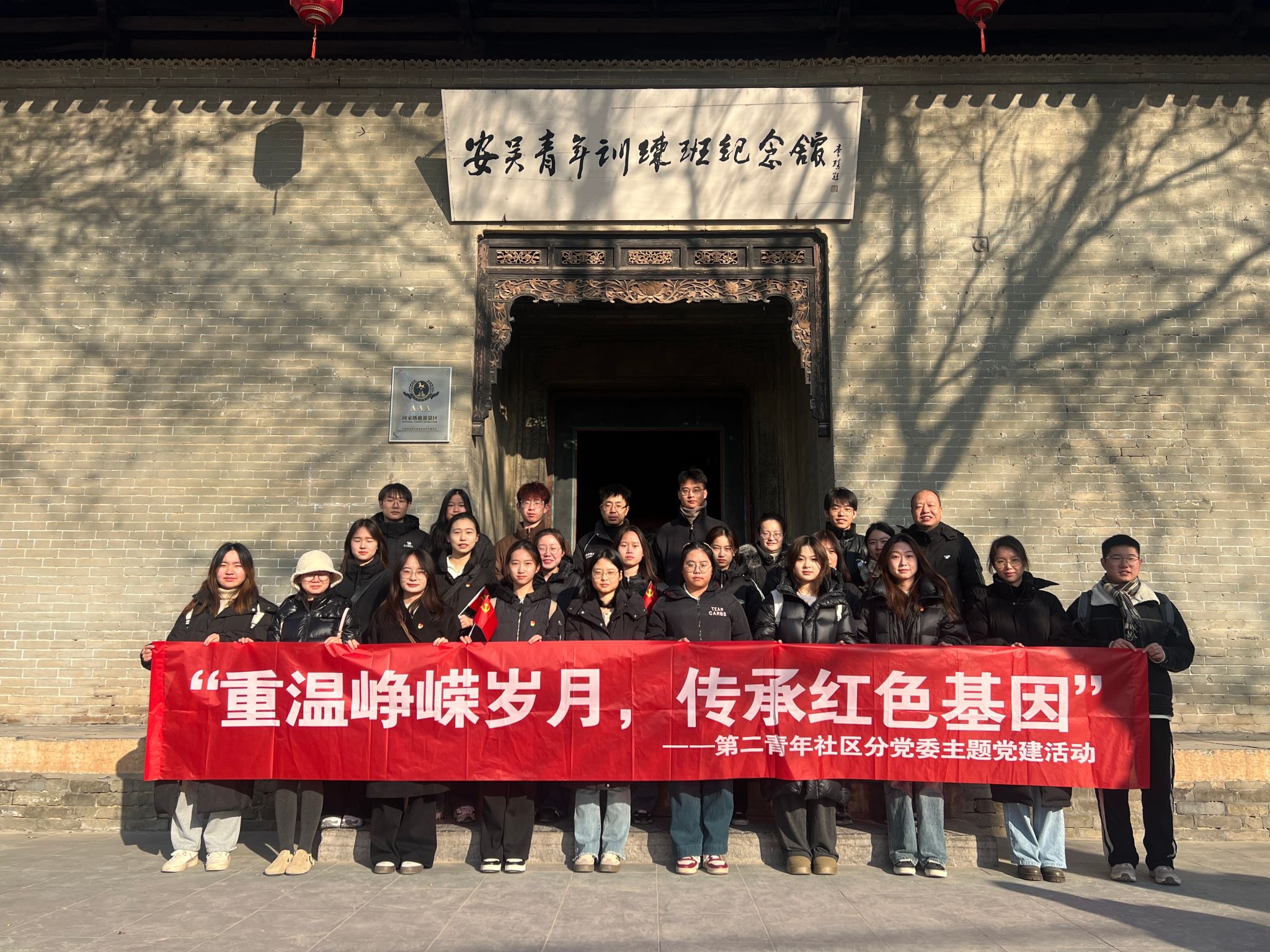 为深入学习贯彻党的二十届三中全会精神,引导师生党员深化对中国共产党革命历史的理解和感悟,传承红色基因,坚定理想信念。2024年12月17日,第二青年社区分党委师生党员代表共计30人,前往陕西省咸阳市泾阳县安吴青训班红色教育基地和郑国渠,开展“重温峥嵘岁月、传承红色基因”的主题党日活动。