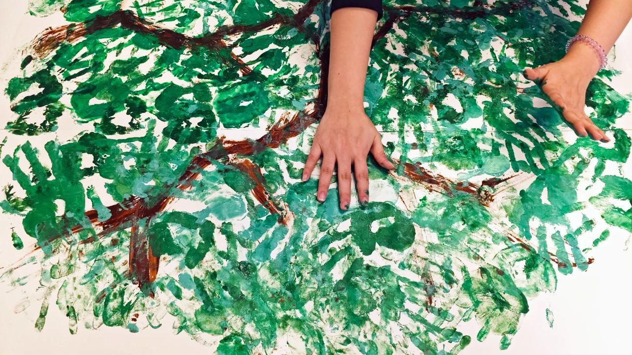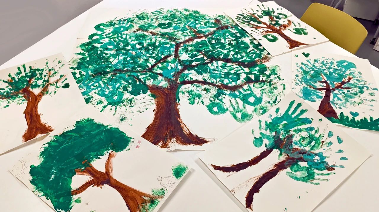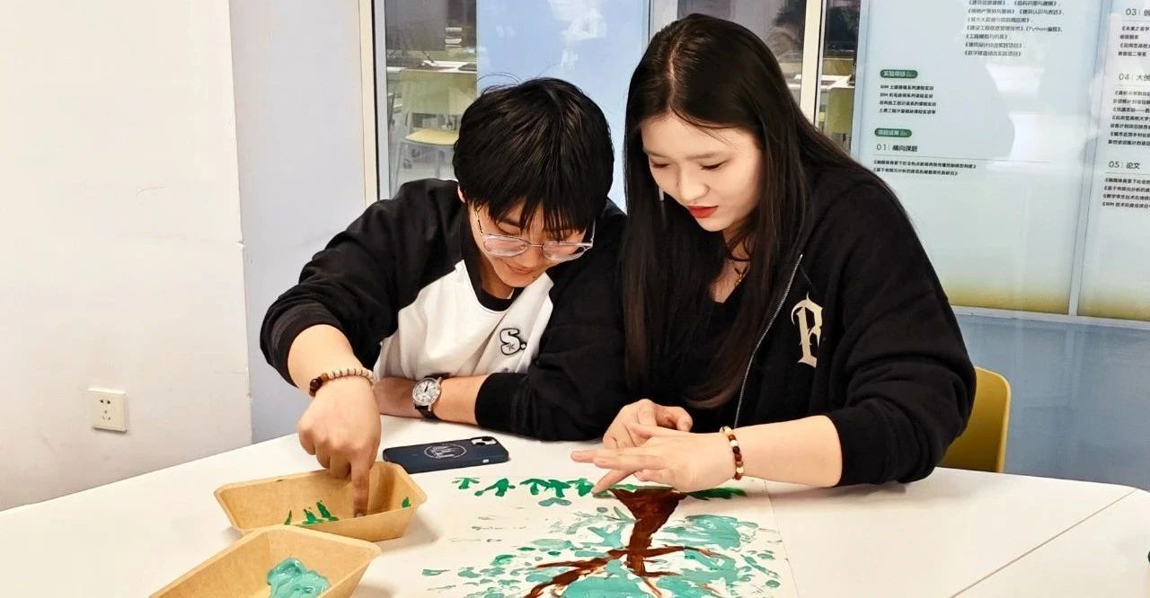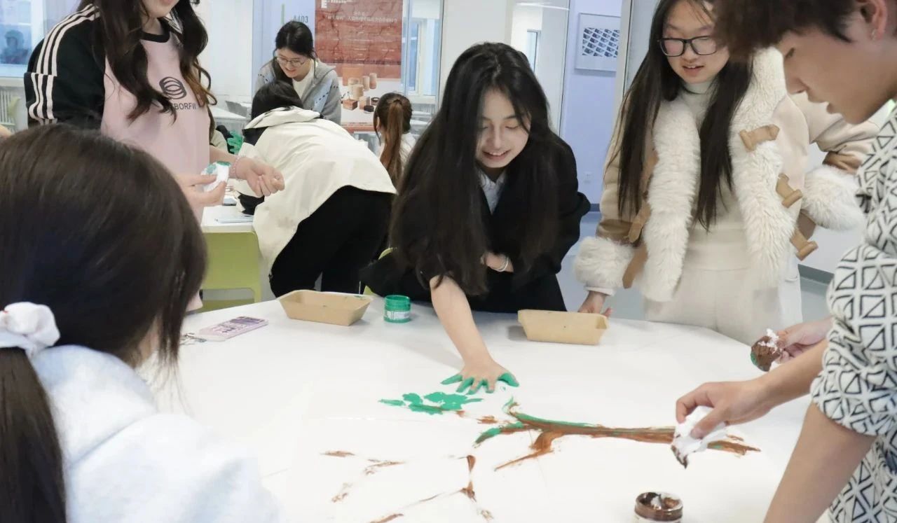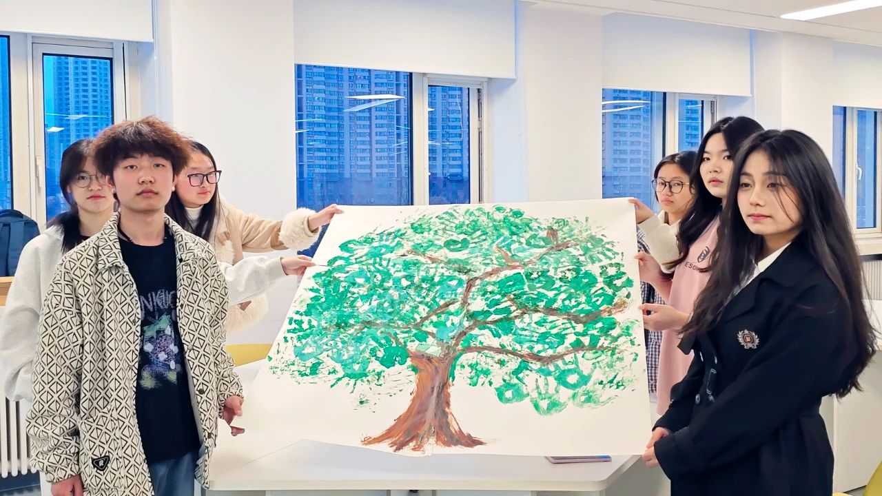 “拓印绿色掌印”环节将现场氛围推向高潮。绿色颜料与画布准备就绪,同学们围坐在一起,首先勾勒出树的轮廓和形状,然后用指尖轻蘸颜料,缓缓按压在画布之上。只见同学们反复调整手掌角度,只为拓印出不同形状的树冠。大家拓印完成后,看着鲜艳的绿色掌印,与身旁伙伴相视而笑,眼神满是欣喜。“再拓几个掌印,这棵‘大树’会更繁茂!”“瞧,我的掌印像不像独特的树叶?”交流声中,画布上的掌印不断汇聚,仿佛真的在不断生长为一棵生机蓬勃的大树。每一枚掌印,都是对环保的郑重承诺;每一抹绿色,都饱含对自然的热爱与守护。