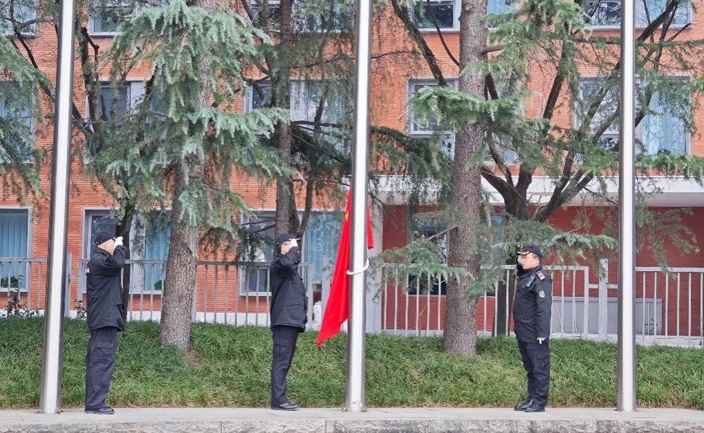 伴随着雄壮的《义勇军进行曲》,五星红旗冉冉升起,迎风飘扬。全体师生肃立注目,表达对祖国的无限热爱和崇高敬意。